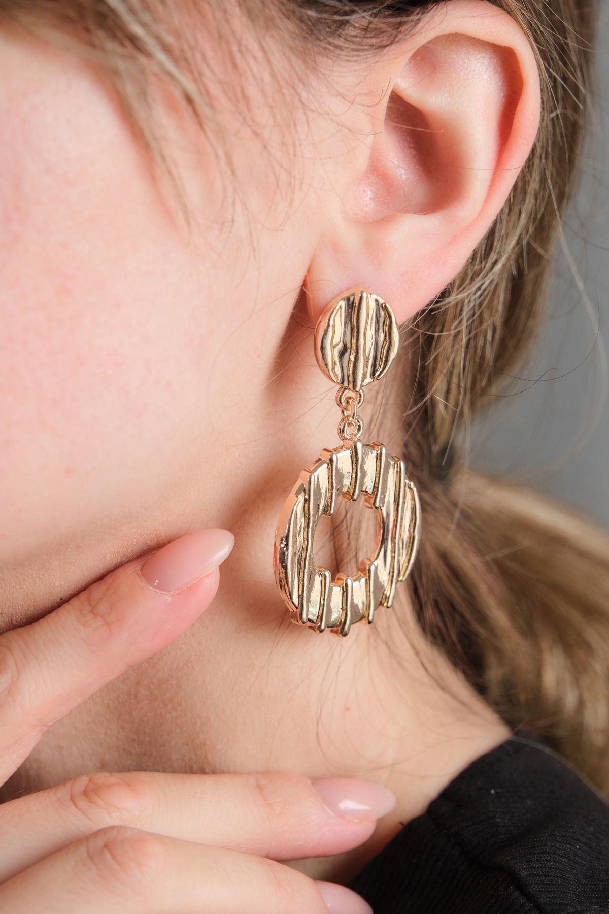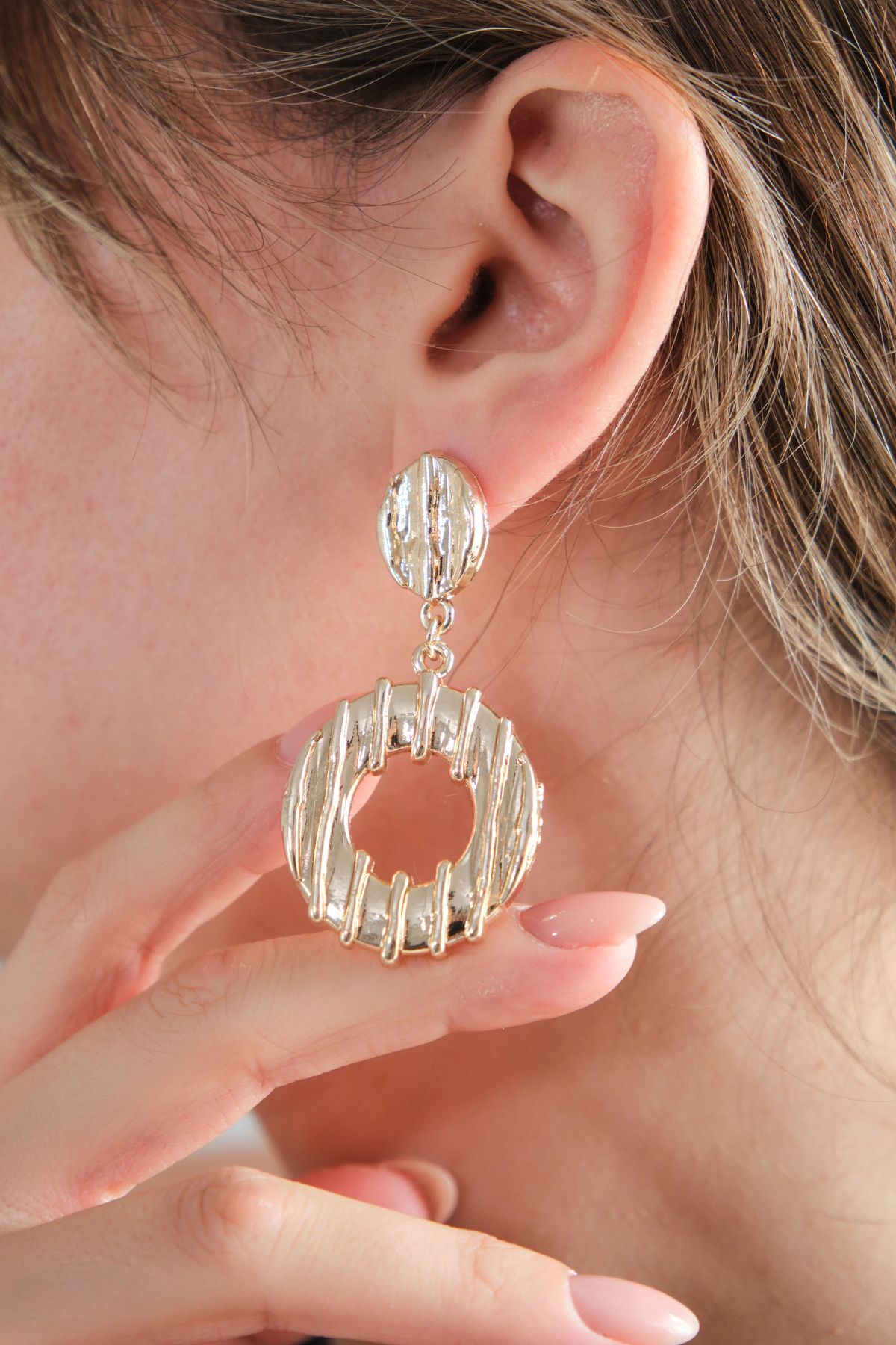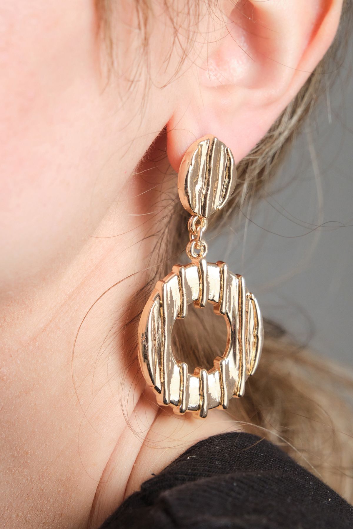 - Bu zarif küpeler, minimal tasarım ve modern estetiğin mükemmel bir birleşimidir. Büyük bir halka figürünün ortasından kesilen küçük bir halka, tasarımın merkezinde öne çıkarken üstte yer alacak şekilde birbirine bağlanmıştır. Küçük halkanın ince ve dengeli duruşu, hareketli ve zarif bir görünüm kazandırır. Altın kaplama detaylarla işlenmiş olan bu küpeler, hem sade hem de şık bir stil arayanlar için ideal bir tercihtir. Hafif yapısıyla günlük kullanımda konfor sunarken, zarafetiyle özel günlerde de stilinize modern bir dokunuş katar. Bu tasarım, minimalizmi ve ince detayları sevenler için mükemmel bir aksesuardır.