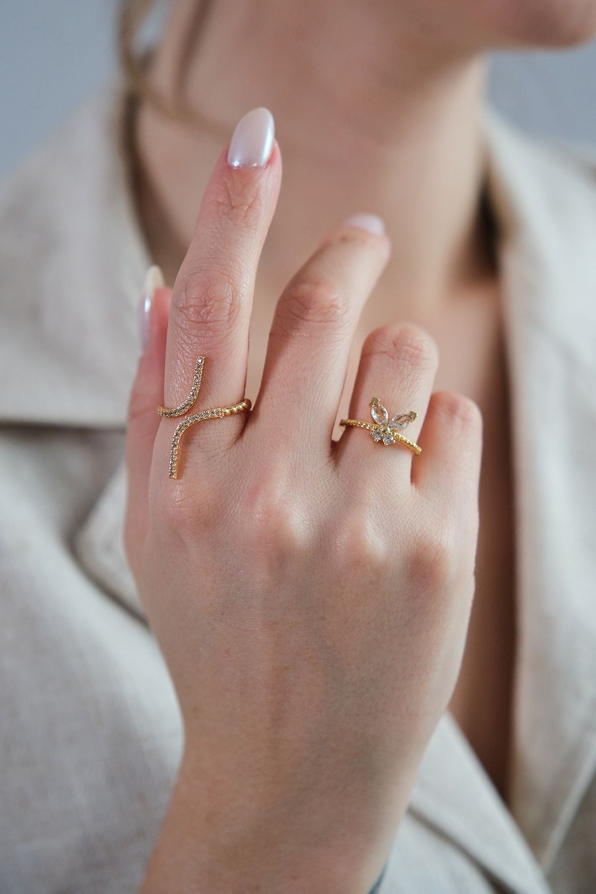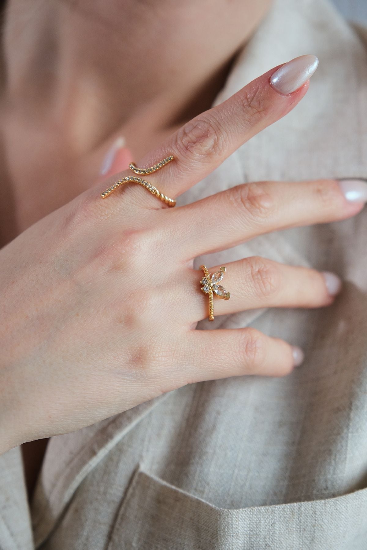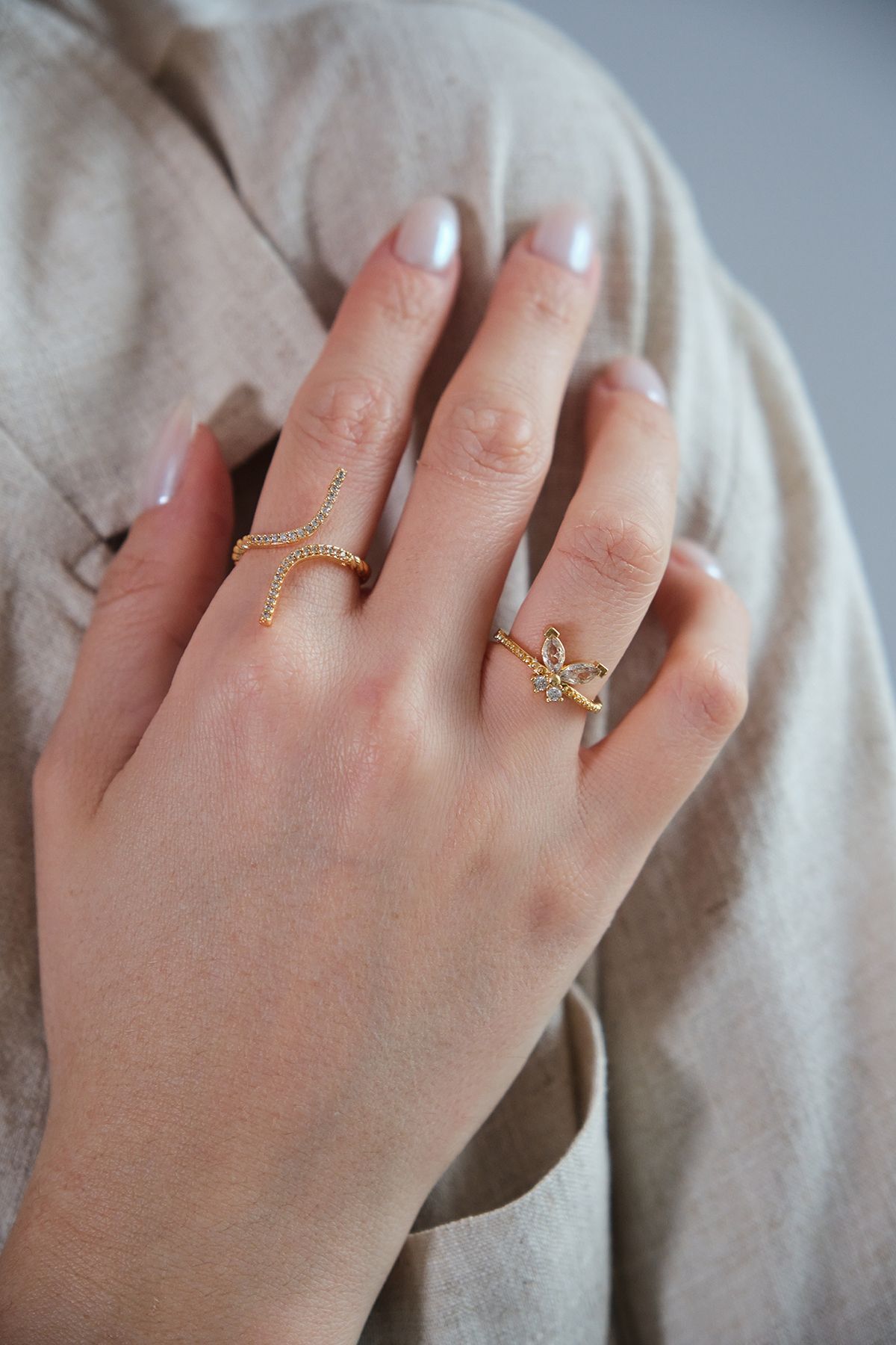 2'li Gold Zirkon Taşlı Kelebek ve Zarif Yüzük Seti