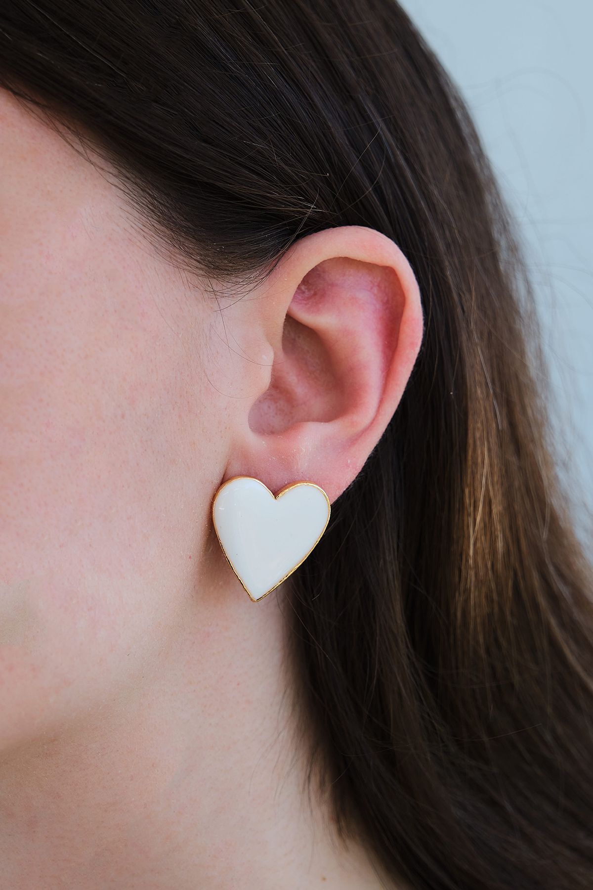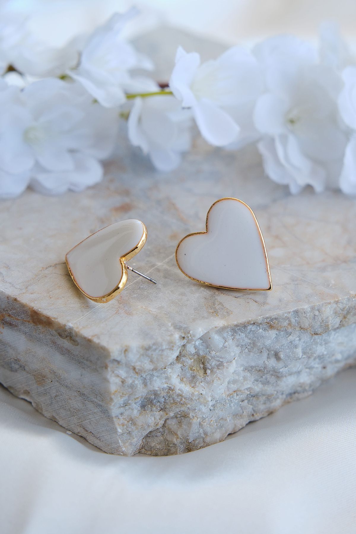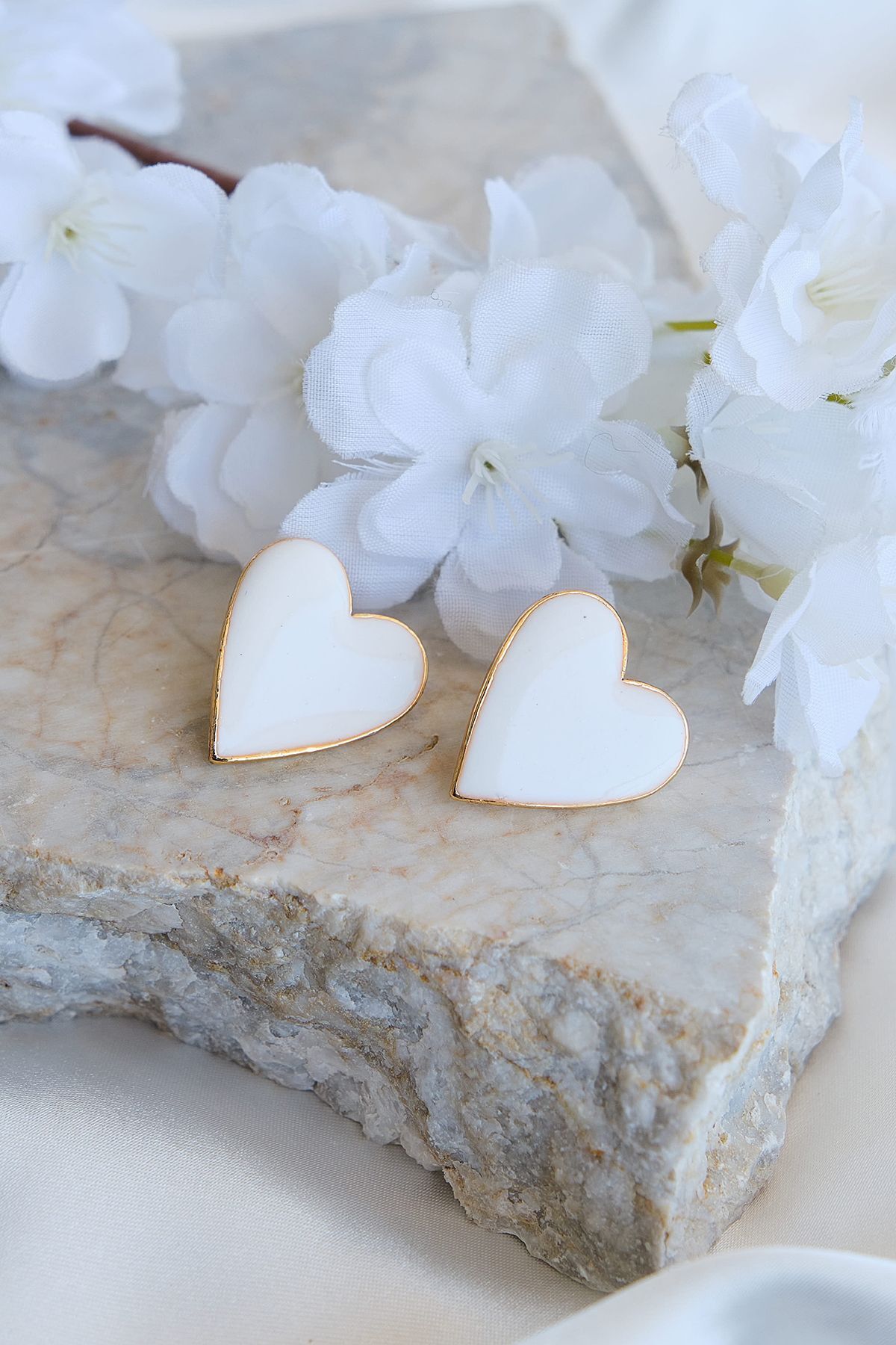 Beyaz mineli kalp küpe, altın kaplama kalp takı, minimal gold küpe modelleri, beyaz mine detaylı aksesuar, romantik çivi küpe, yerli üretim takı, şık kadın aksesuarları, Aurrari özel tasarım.