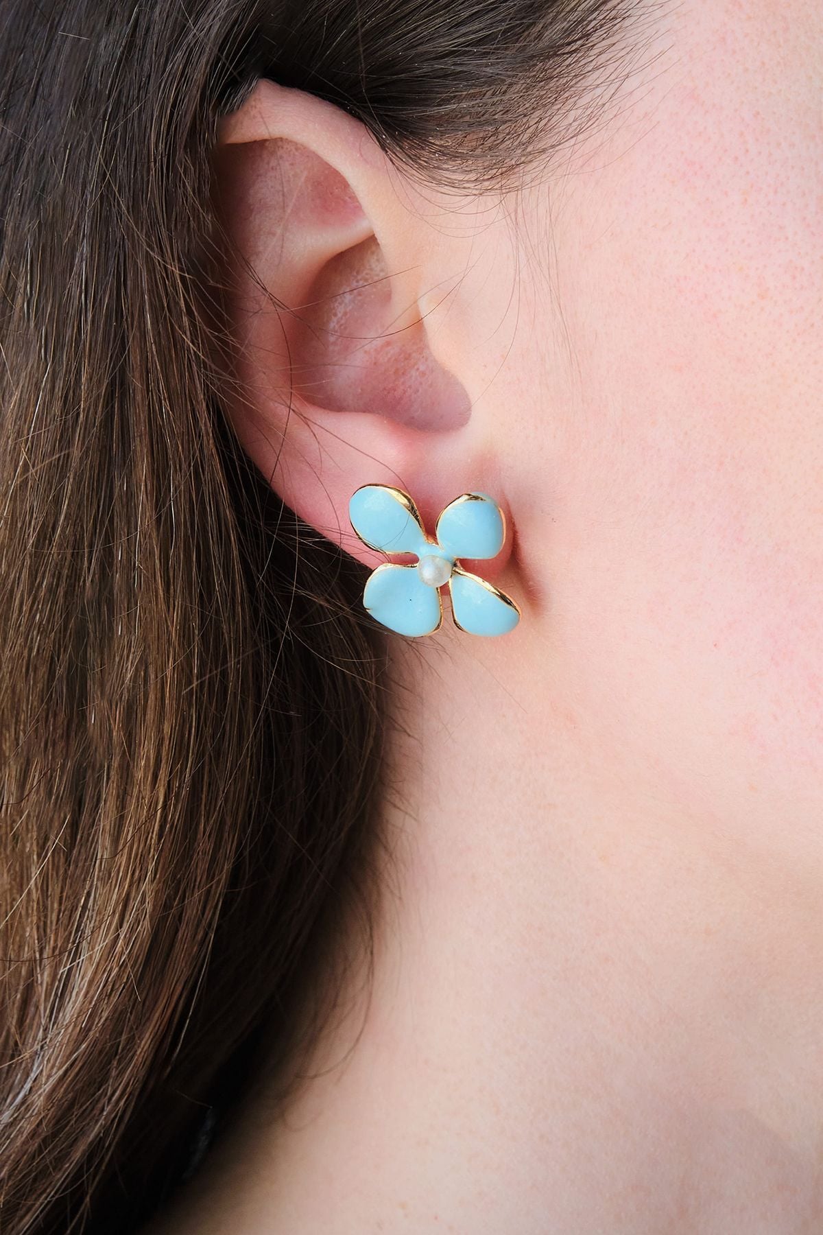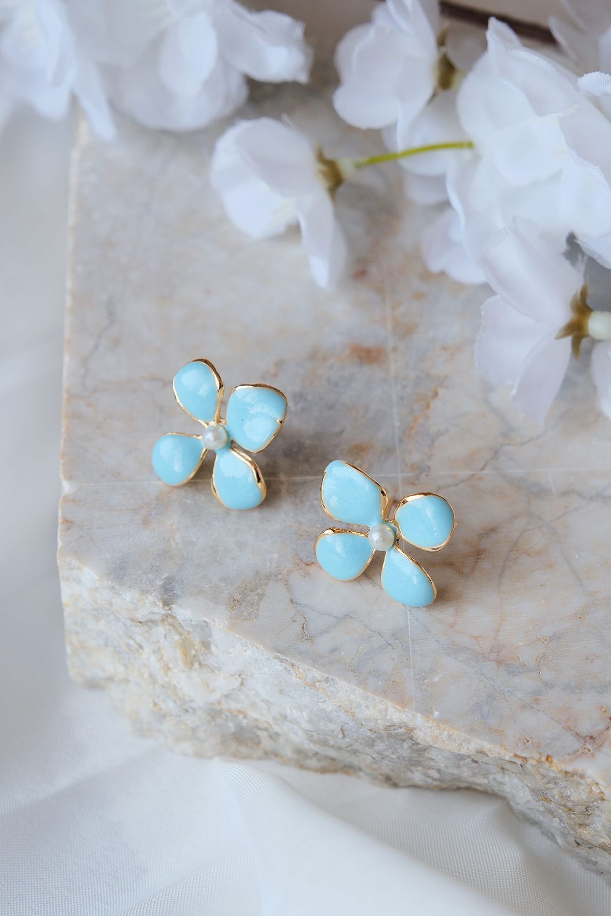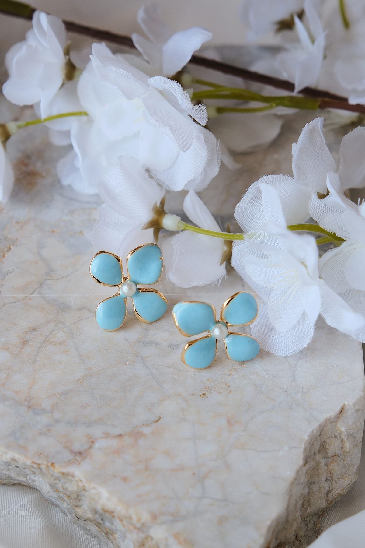 Altın Kaplama İncili Acık Mavi Mineli Çiçek Küpe
