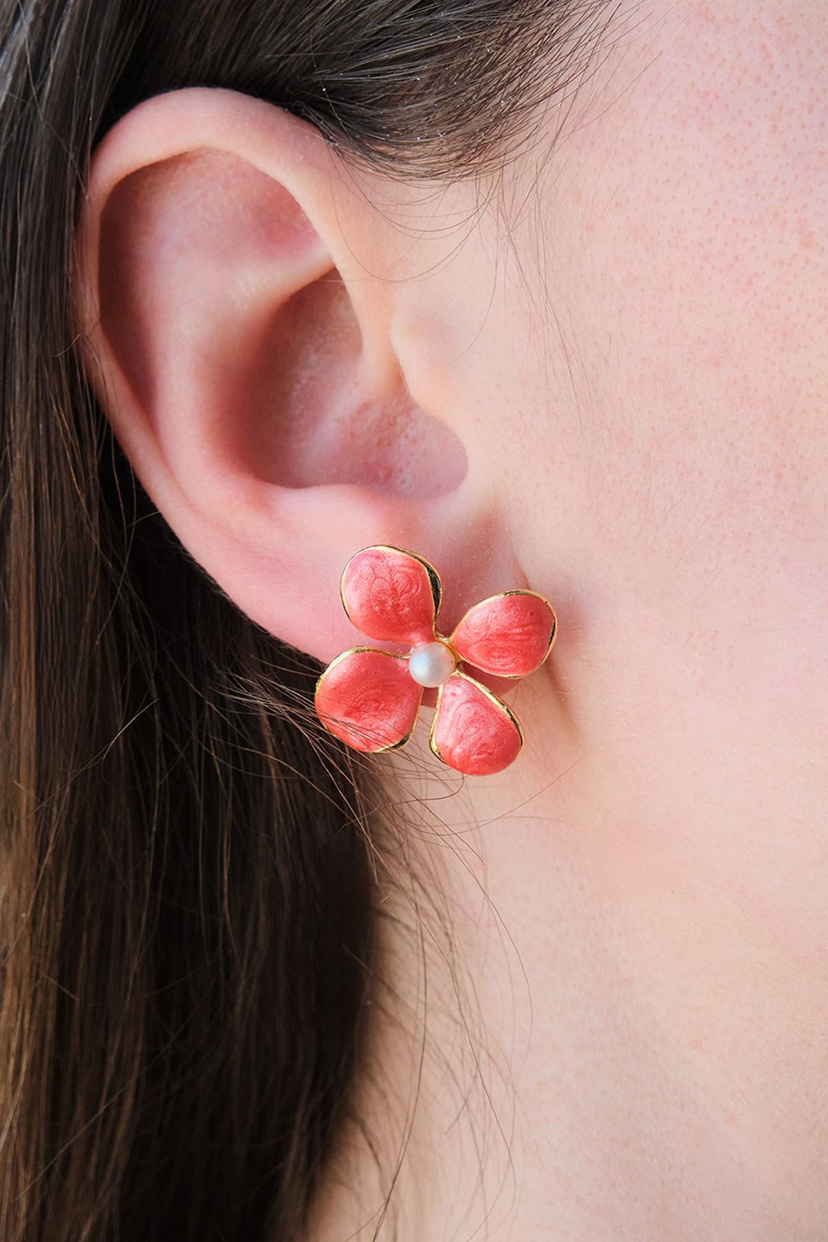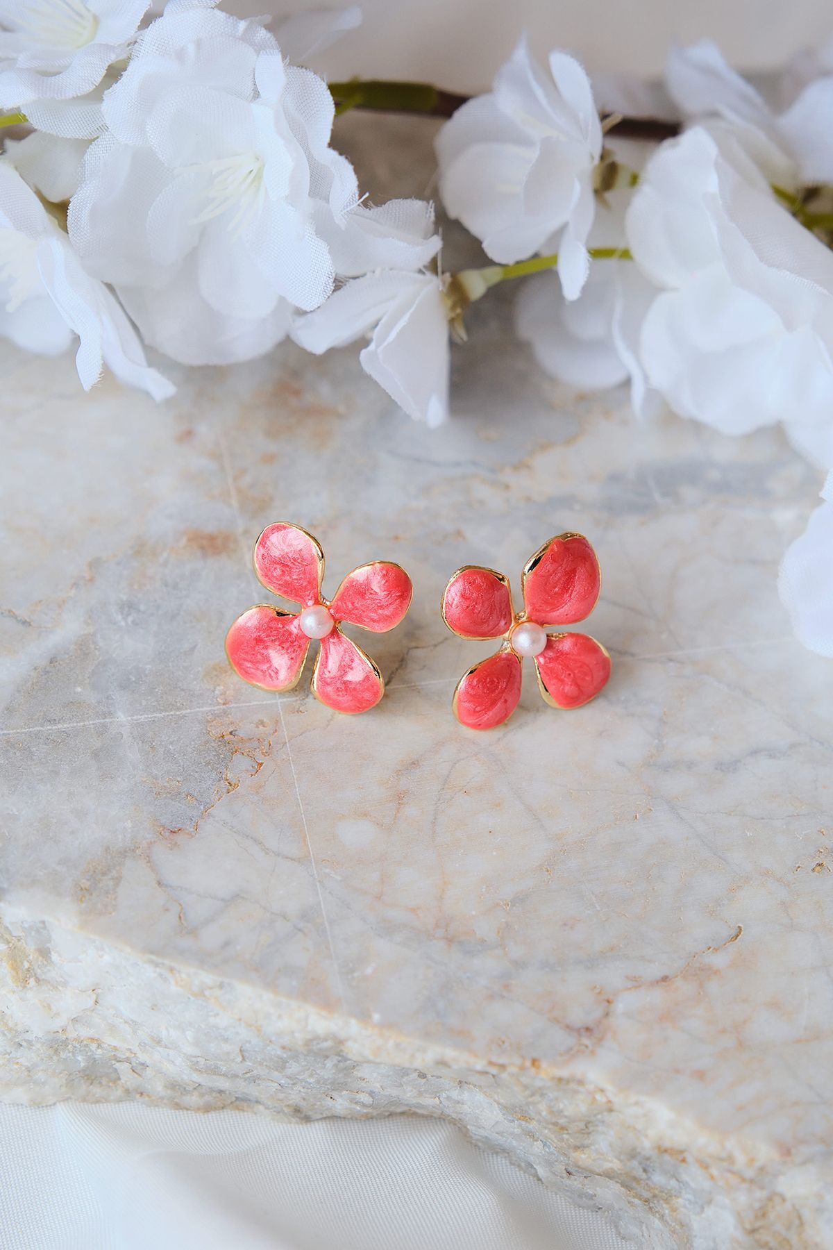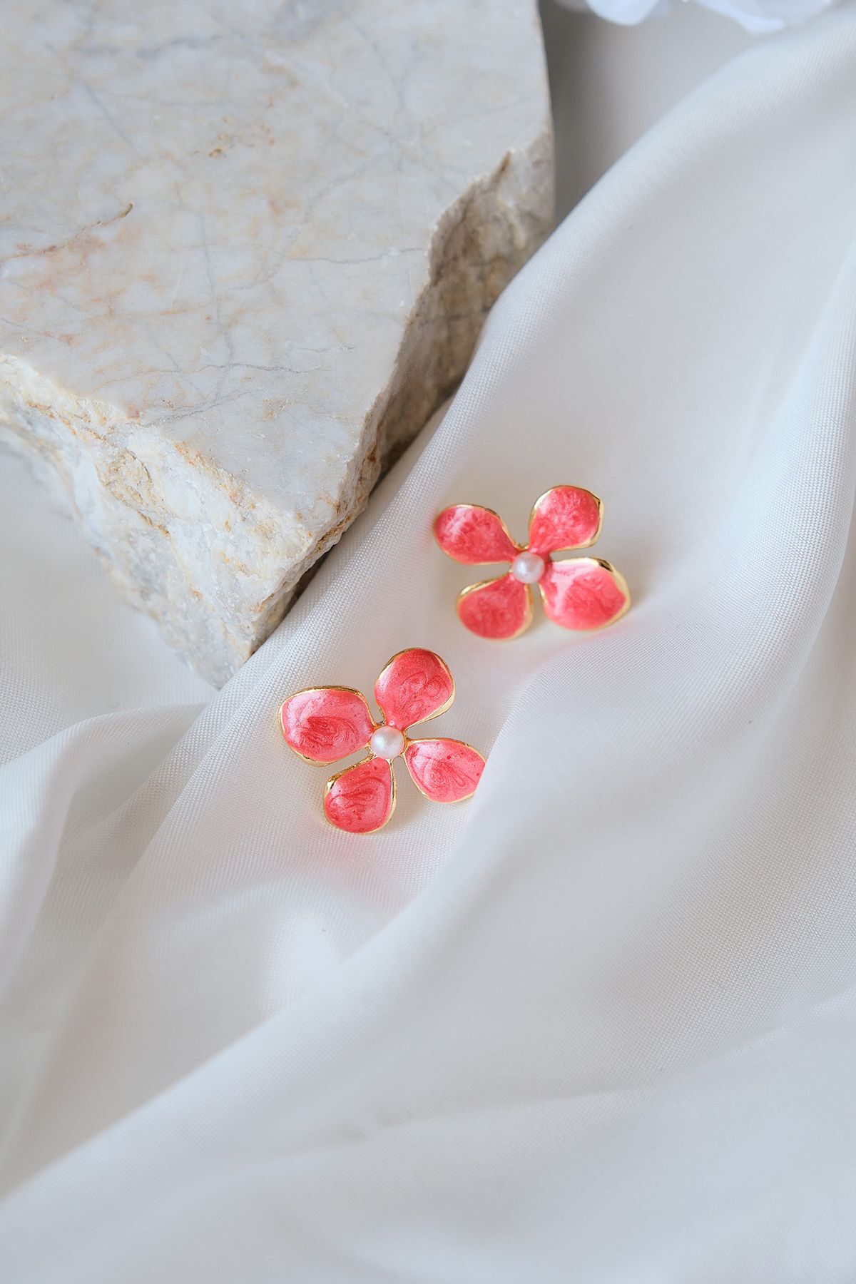 Altın Kaplama İncili Gül Rengi Mineli Çiçek Küpe