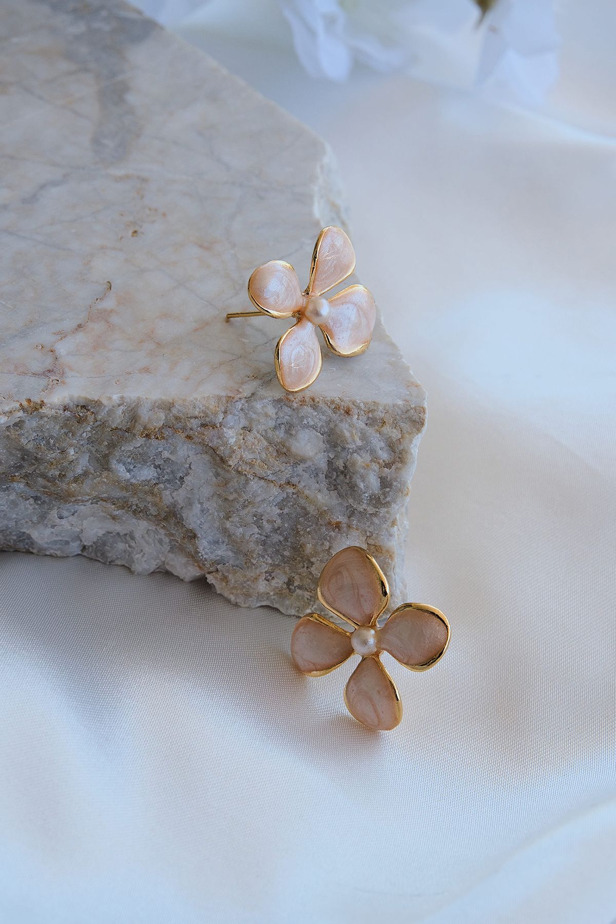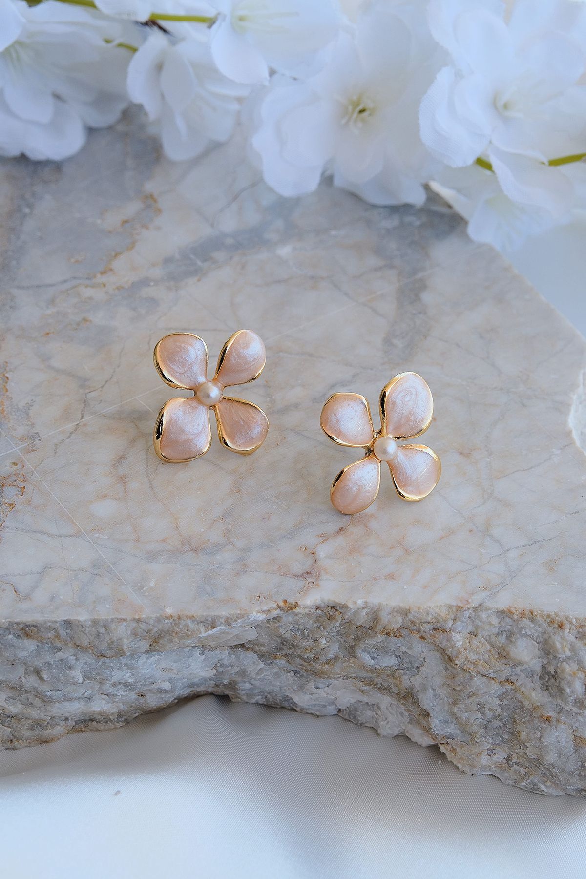 Altın Kaplama İncili Mineli Çiçek Küpe