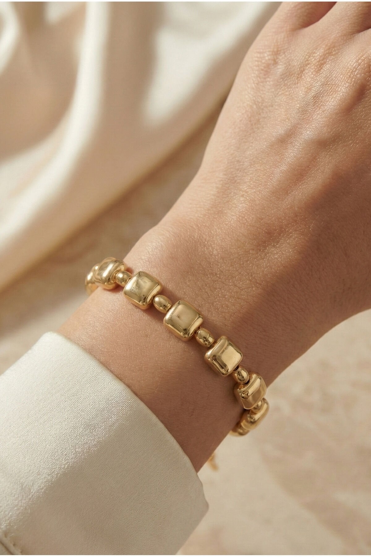- Ayarlanabilir tasarımı sayesinde farklı bilek ölçülerine kolayca uyum sağlar ve rahat bir kullanım sunar.; - Yetişkinler için ideal bir aksesuar seçeneği olan bu bileklik, her yaş grubuna hitap eder.; - Kolay temizlenebilir yapısı sayesinde nemli bir bezle silinerek bakımı pratik bir şekilde yapılabilir.; - Ekru rengiyle zarif ve sade bir görünüm sunar, her türlü kıyafetle uyum sağlar.; - Unisex tasarımıyla hem kadınlar hem de erkekler tarafından rahatlıkla tercih edilebilir.; - Taş detayları içermeyen sade yapısıyla minimalist tarzı sevenler için idealdir.; - Altın kaplama materyali ile şık bir parlaklık ve dayanıklılık sunar.; - Standart özellikleriyle günlük kullanım için uygundur; hem günlük hem de özel günlerde tercih edilebilir.; - Pirinç materyal kullanımı sayesinde uzun ömürlü ve kaliteli bir deneyim vaat eder.; - Türkiye menşeli olmasıyla yerel üretim desteklenmiş olurken, kalite standartlarına uygunluk garanti edilir.;