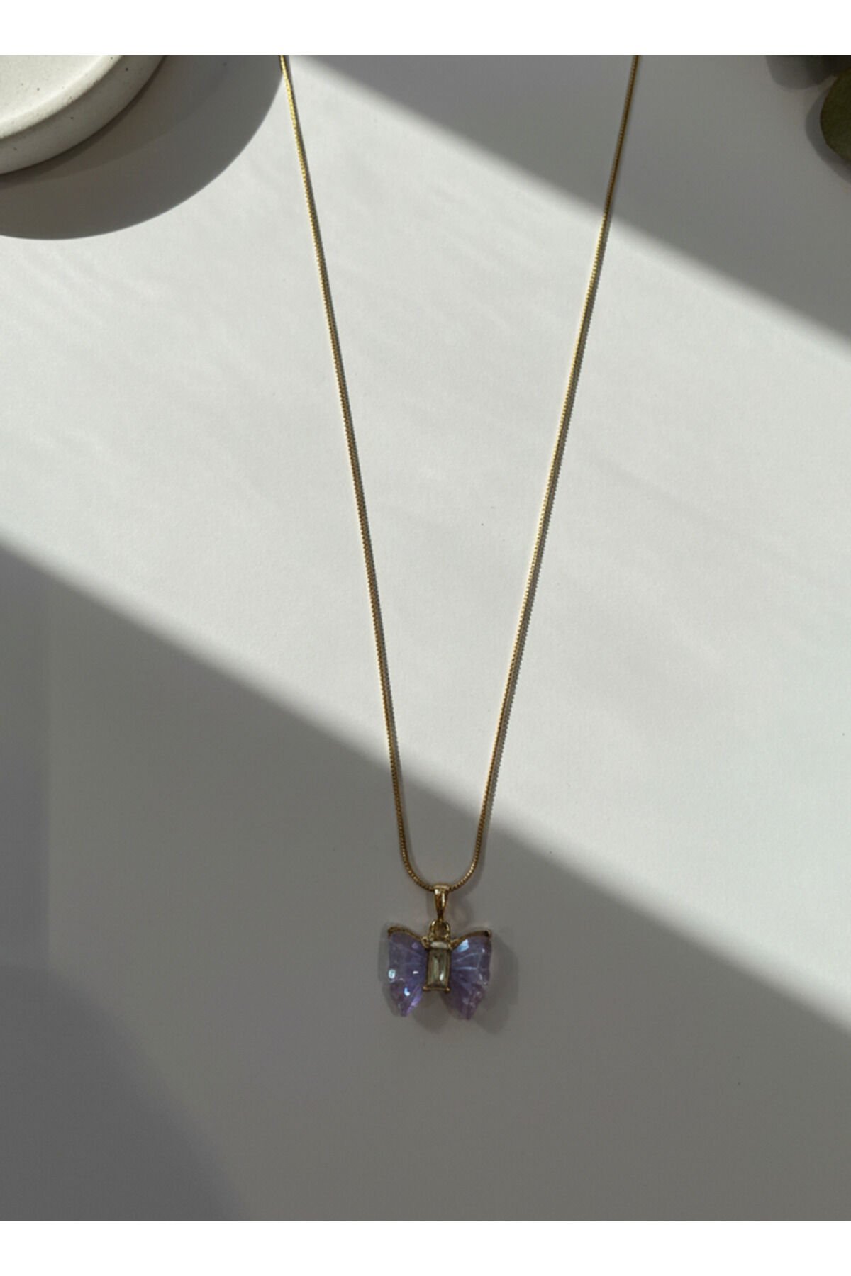 Altın Kaplama Mor Kelebek Ve Baget Zirkon Taşlı Çelik Kolye