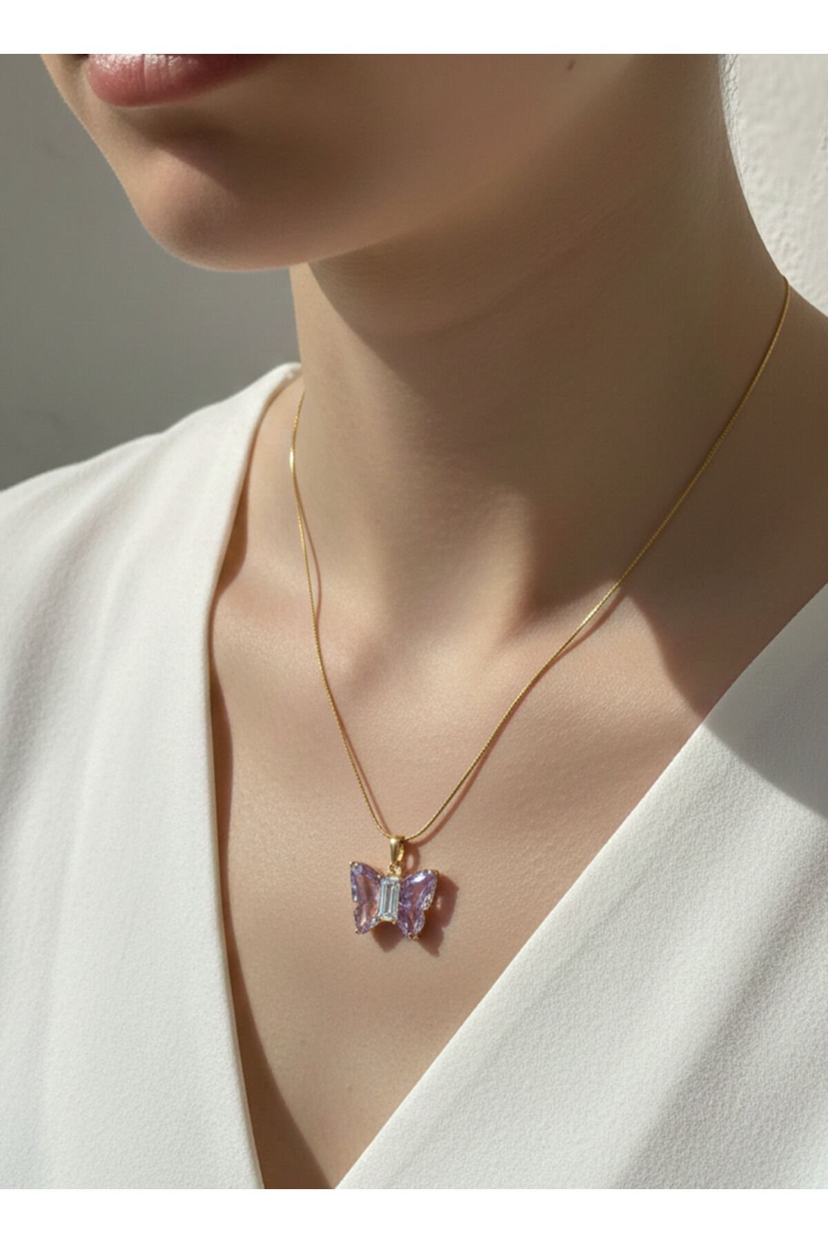 Altın Kaplama Mor Kelebek ve Baget Zirkon Taşlı Çelik Kolye – Kararmaz Lüks Tasarım