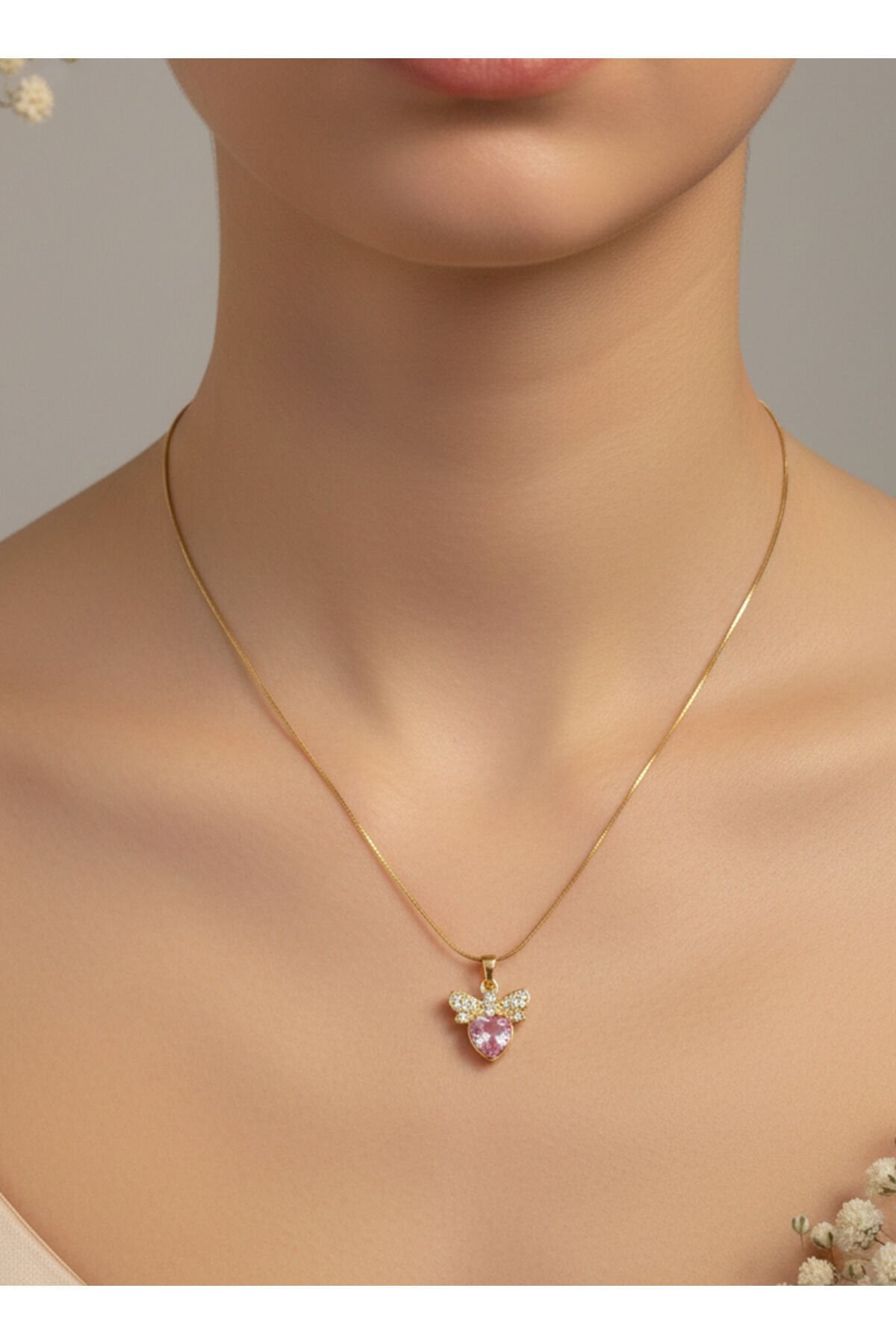 Altın Kaplama Pembe Kalp ve Fiyonk Zirkon Taşlı Çelik Kolye