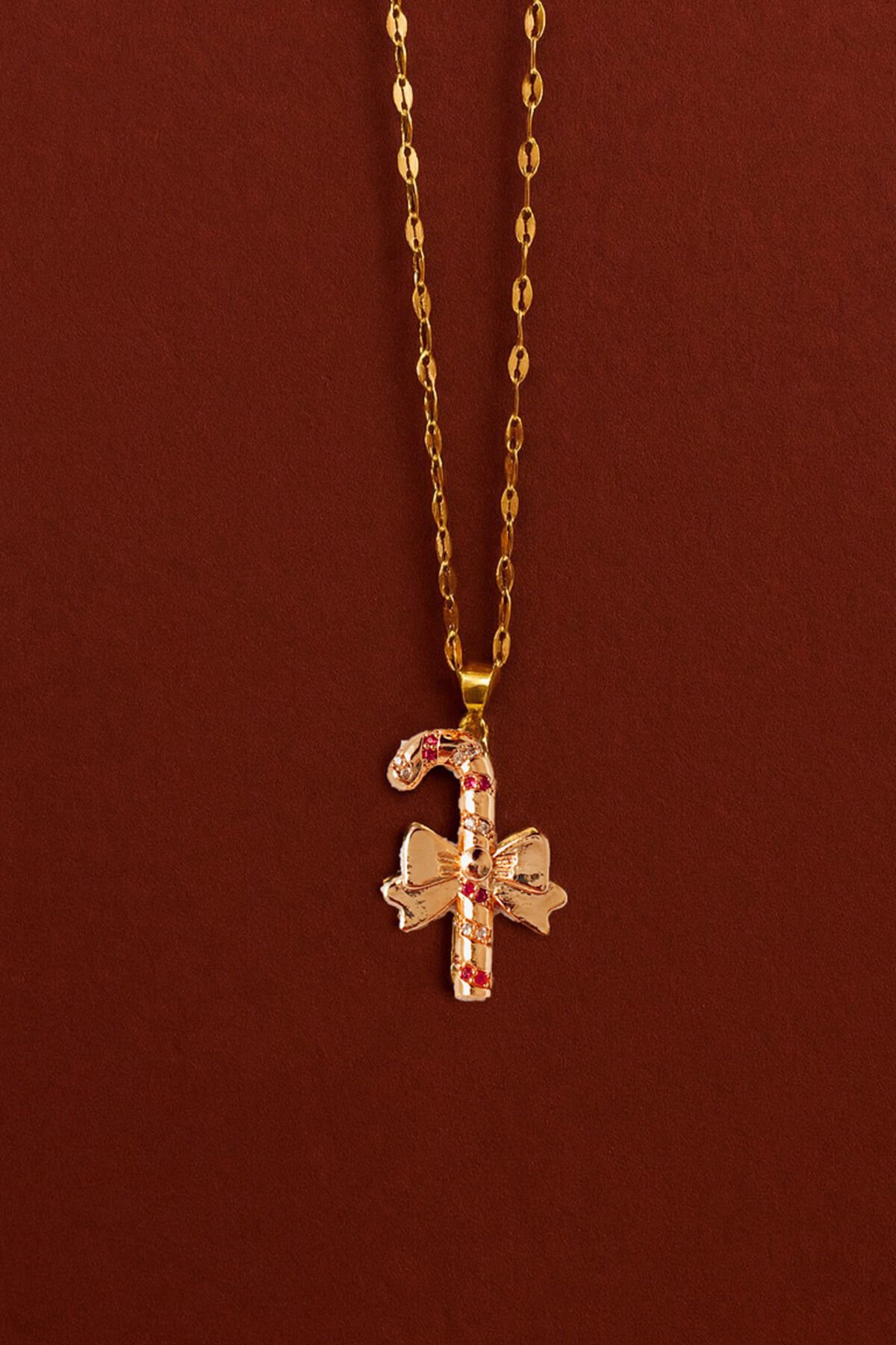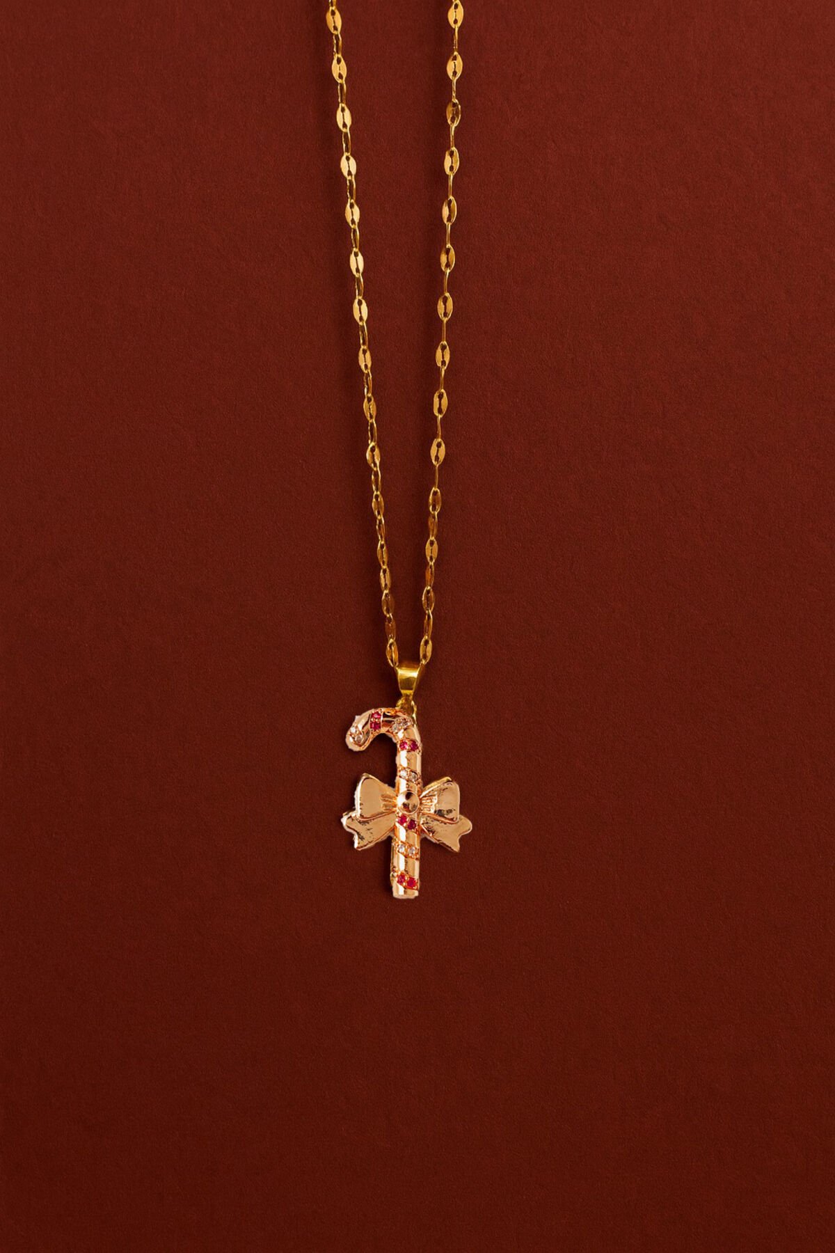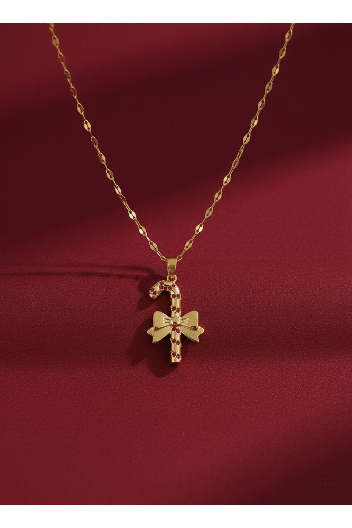 Altın Kaplama Pembe Zirkon Taşlı Baston Model Çelik Kolye – Yılbaşı Hediyesi
