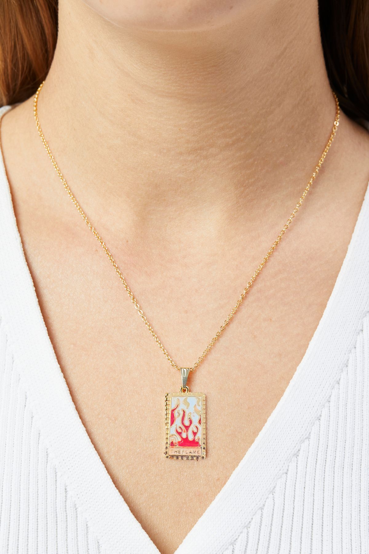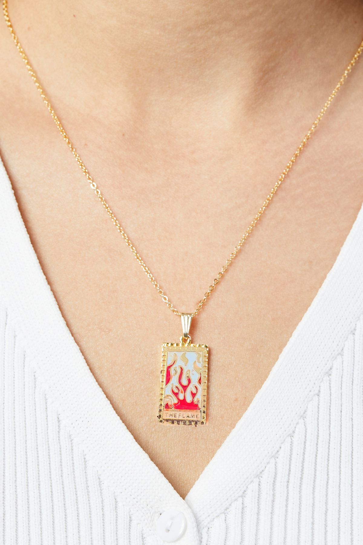 Kadın Altın Kaplama Tarot Kolye - The Flame (Alev) Kartı Kırmızı Emaye Detaylı Zincir Kolye
