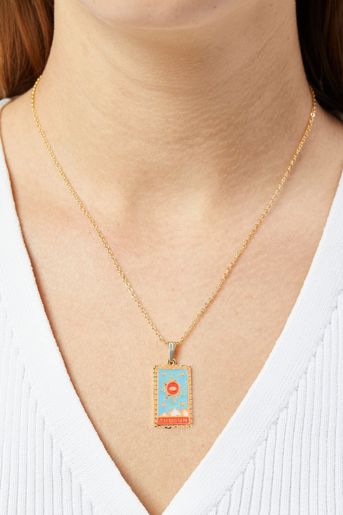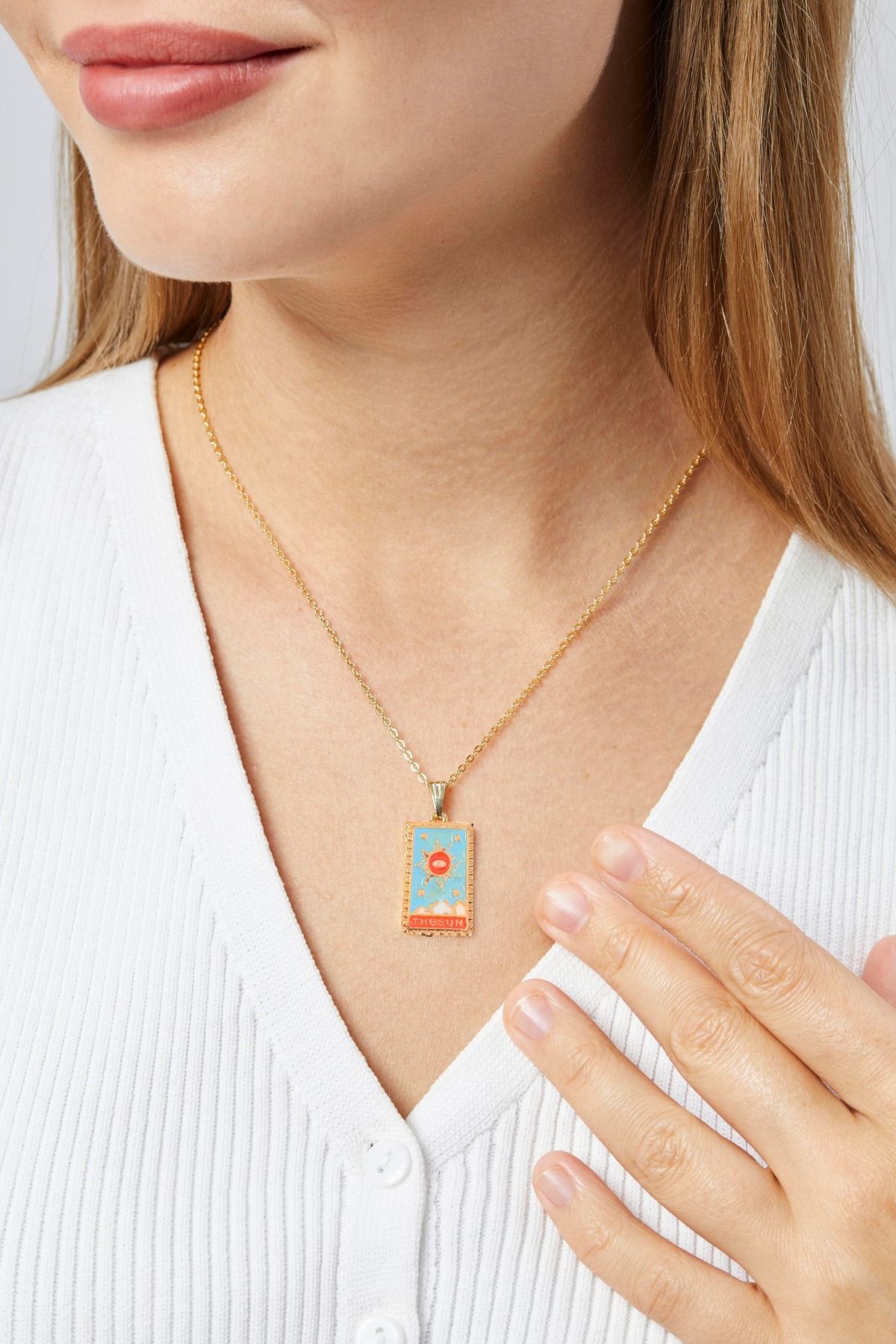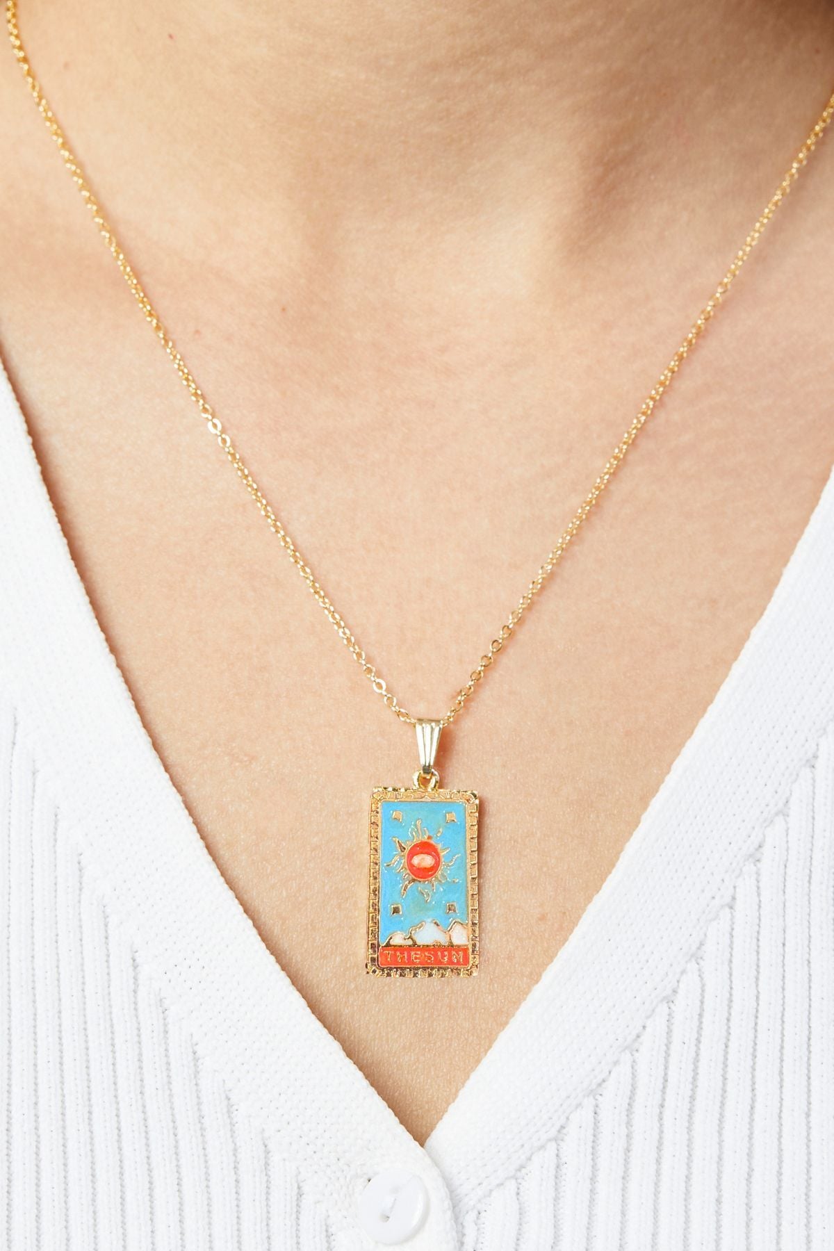 Bu Tarot kolyeyi, Aurrari’nin Ekru Dokulu Kumaş Elbisesi ile kombinleyerek beyazın sadeliği üzerinde kırmızının çarpıcı etkisini vurgulayabilir; ya da Siyah Kare Yaka Elbise ile kullanarak gece şıklığınıza gizemli bir hava katabilirsiniz.