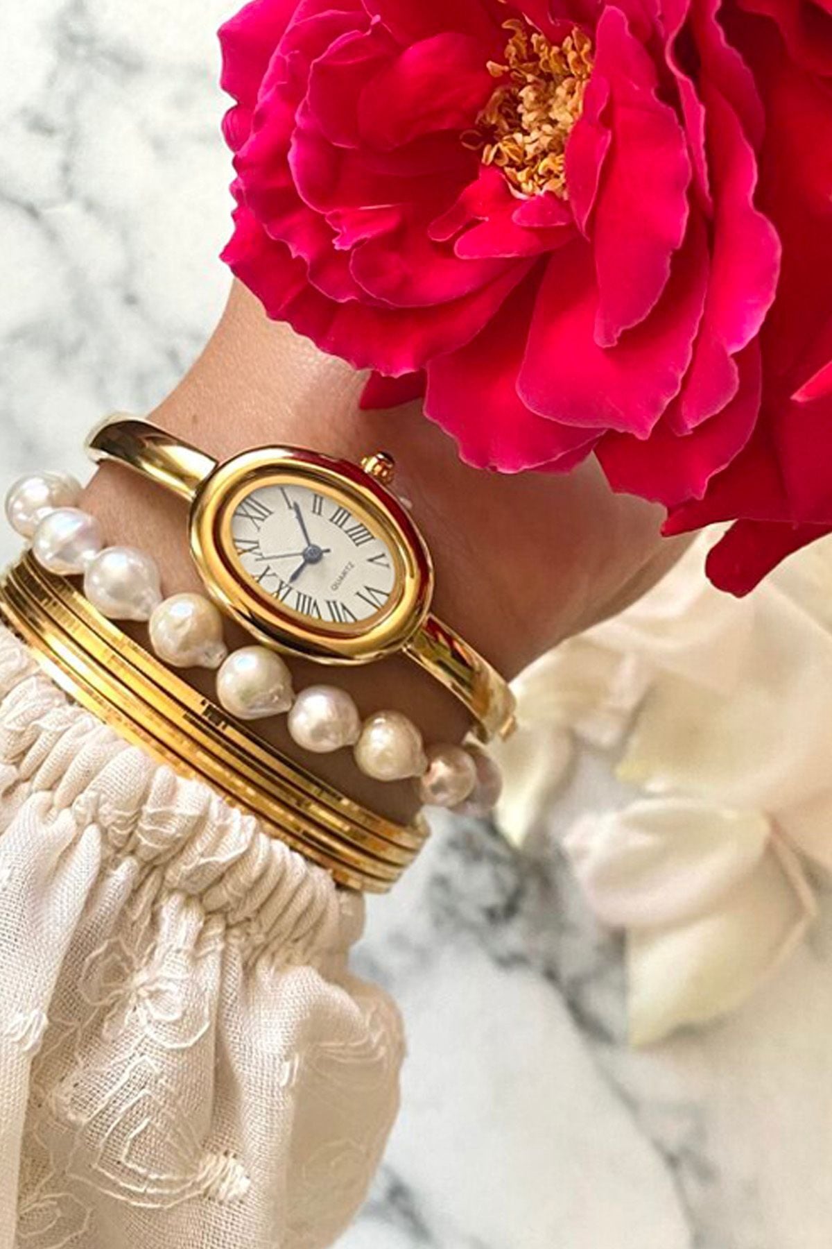 Bu kelepçe saati, Aurrari’nin altın kaplama ince zincir bileklikleri ile aynı bilekte "stacking" yaparak kullanabilir veya tek başına yıldız parça olarak bırakabilirsiniz. Özellikle gece davetlerinde siyah bir elbise ile veya günlük hayatta beyaz bir blazer ceket ile kusursuz bir uyum yakalar.