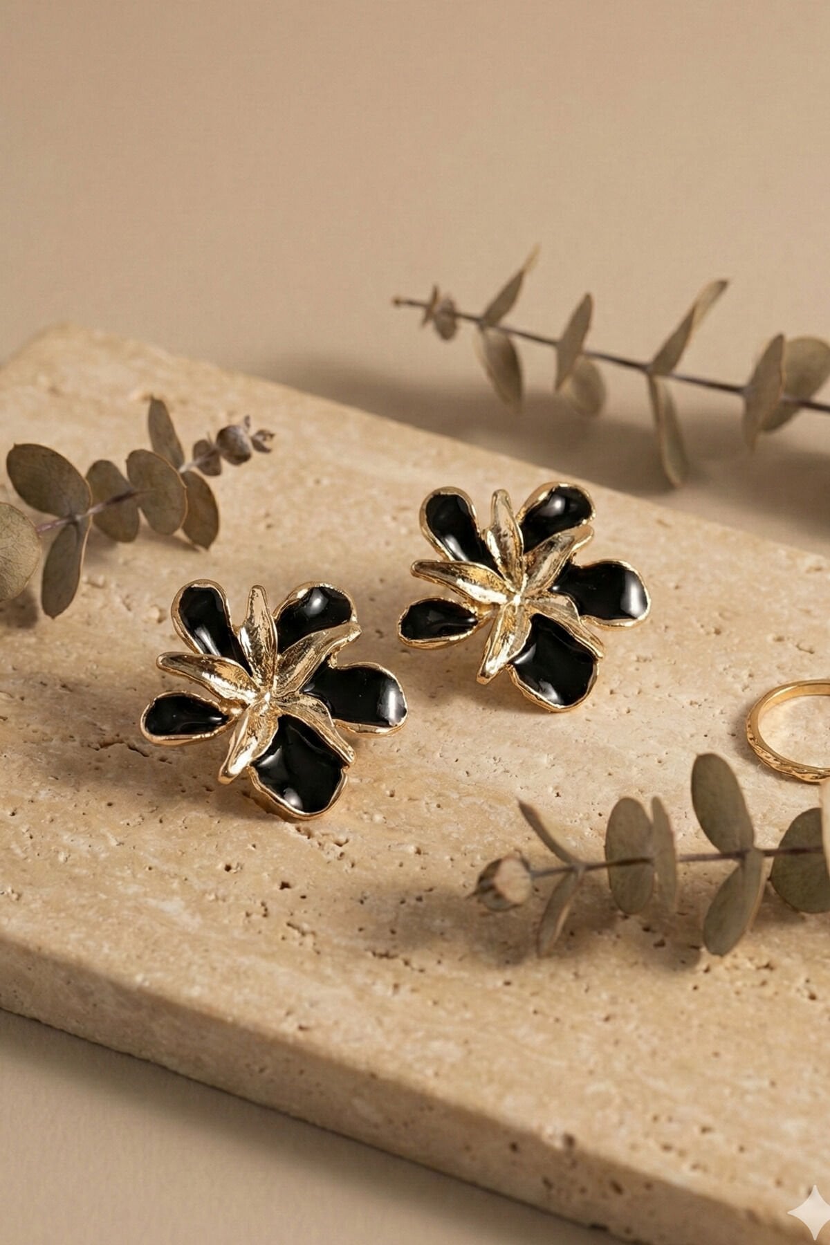 Gold 2'li Çiçek Siyah Mineli Küpe