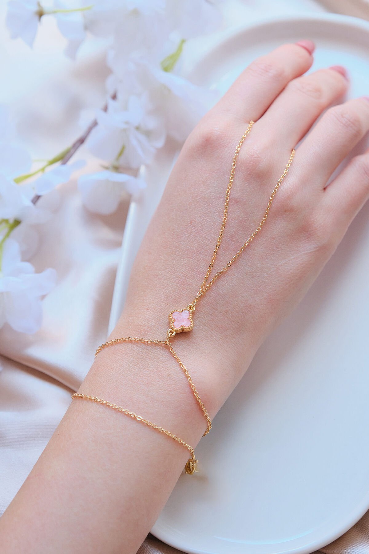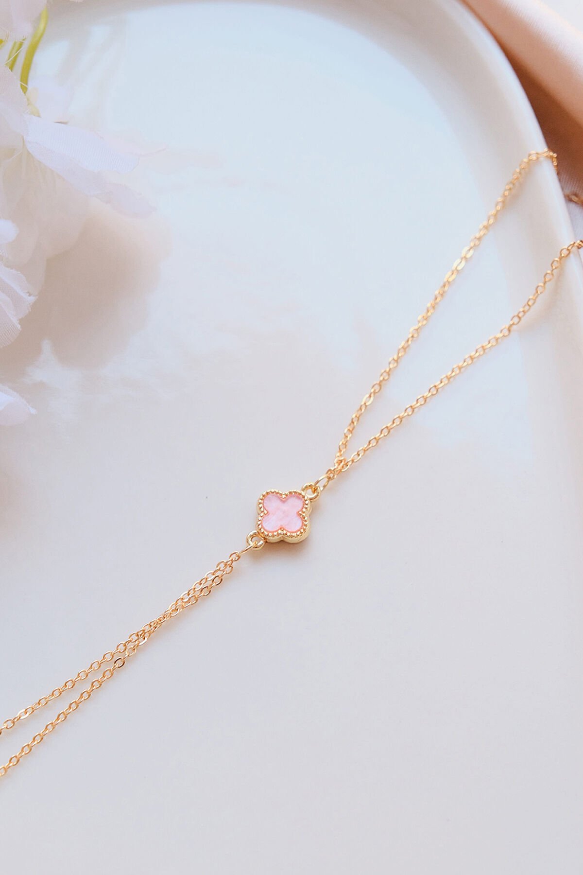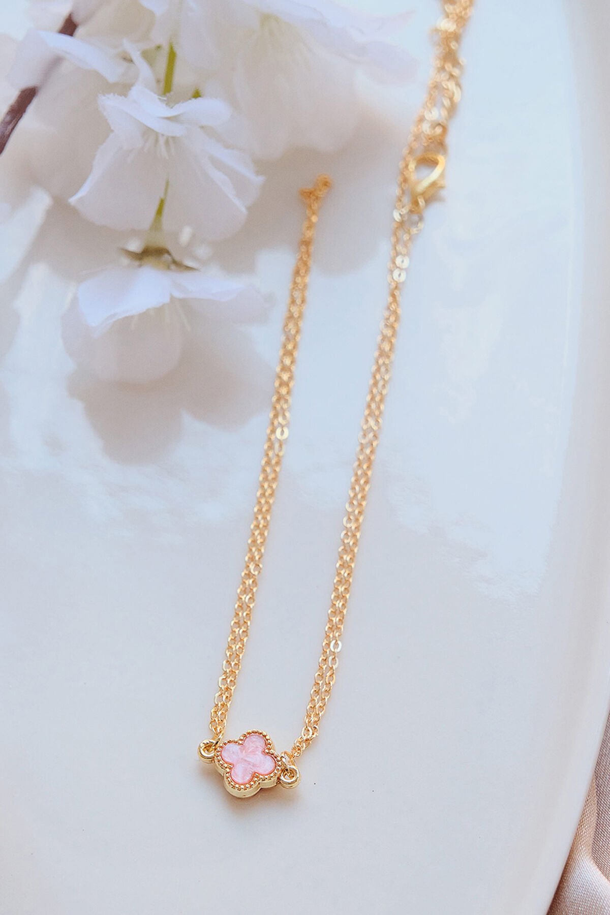 Gold Pembe Doğal Taşlı Yonca Şahmeran