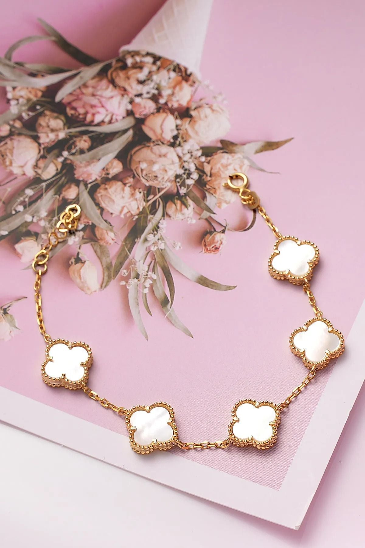 Doğanın Işıltısı Bileğinizde: Gold Sedef Doğal Taşlı Van Cleef Premium Çelik Bileklik