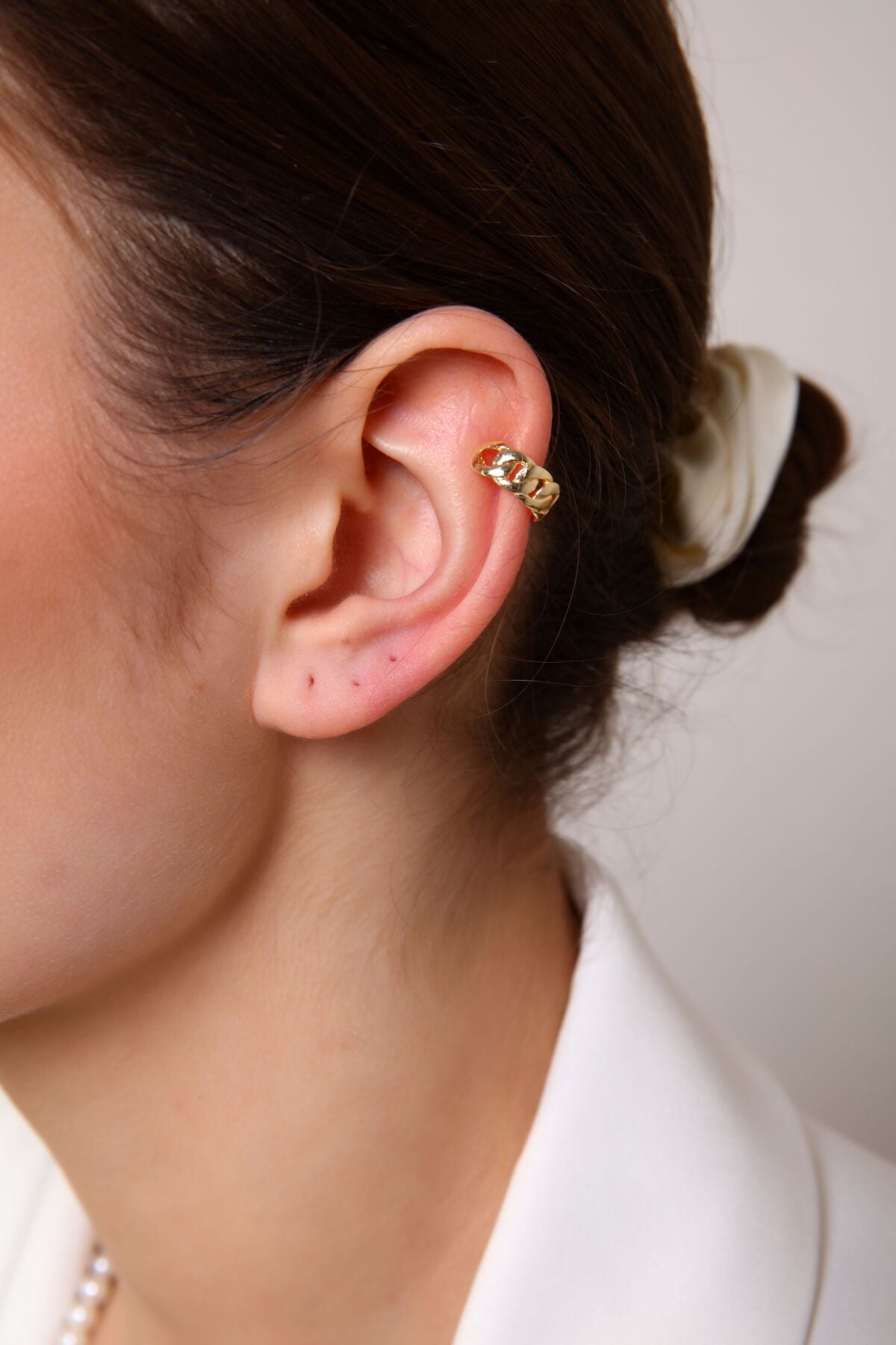Bu zincir model kıkırdak küpesini, Aurrari’nin gold halka küpeleri veya minimal çivi küpeleriyle birleştirerek kulaklarınızda katmanlı (layering) bir görünüm oluşturabilirsiniz. Saçlarınızı tek taraftan toplayarak veya "wet look" (ıslak görünüm) saç stiliyle kullanarak kıkırdak detayını tüm ihtişamıyla ön plana çıkarabilirsiniz.