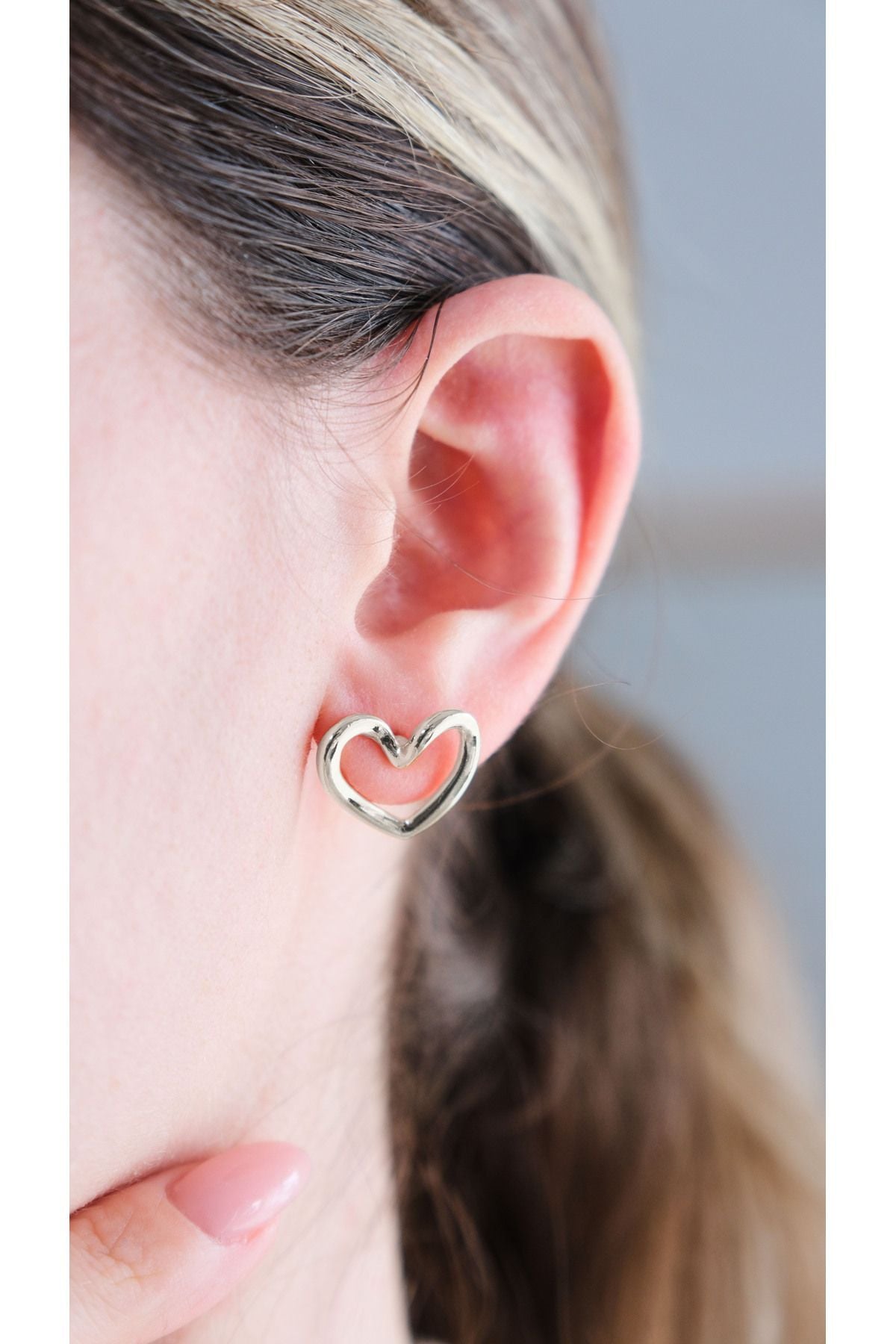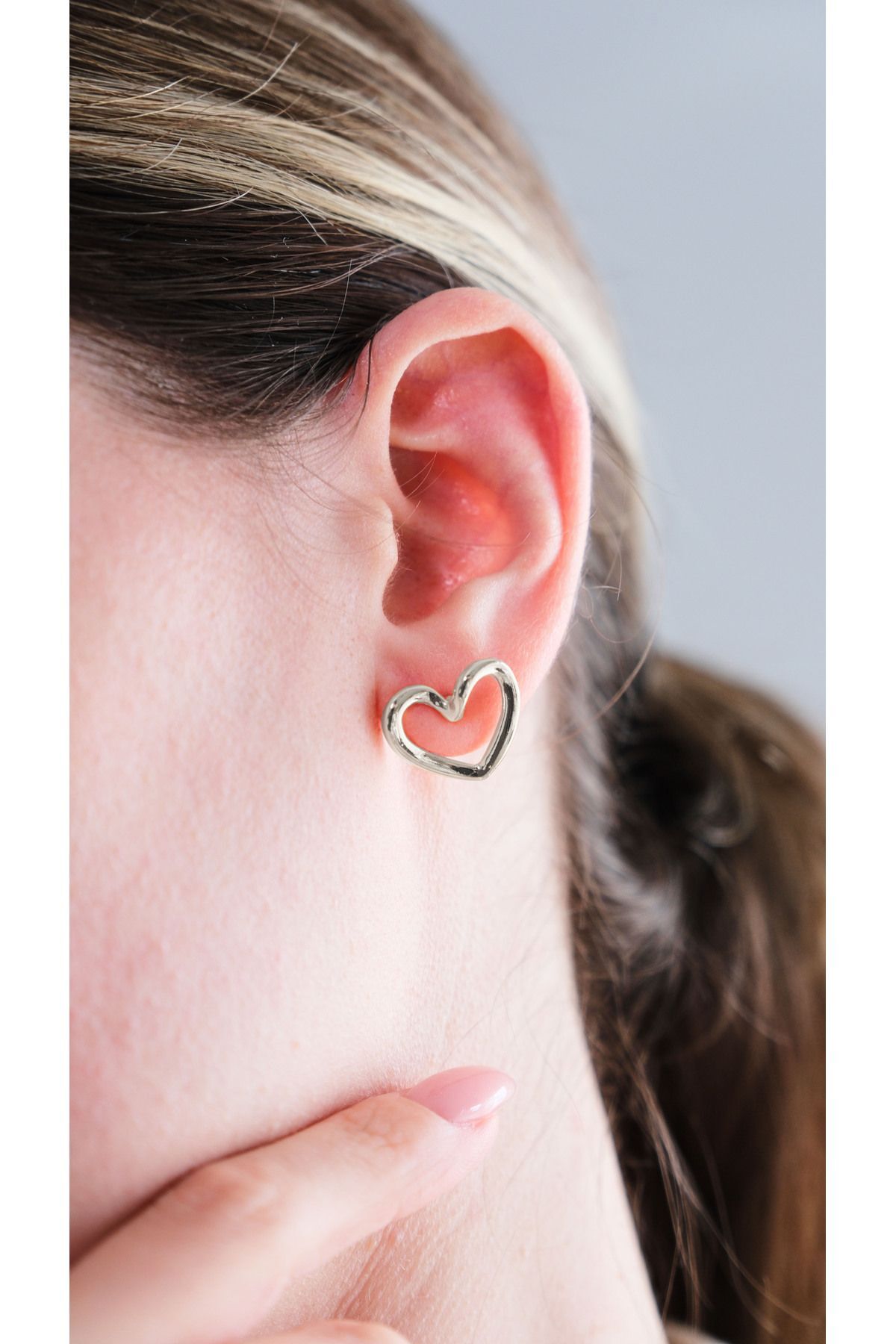 Gümüş kalp döngü küpe, minimal gümüş takı, kalp figürlü çivi küpe, modern gümüş aksesuarlar, minimalist romantik küpe, şık kadın takıları, kararmayan gümüş kaplama, Aurrari özel tasarım küpe.