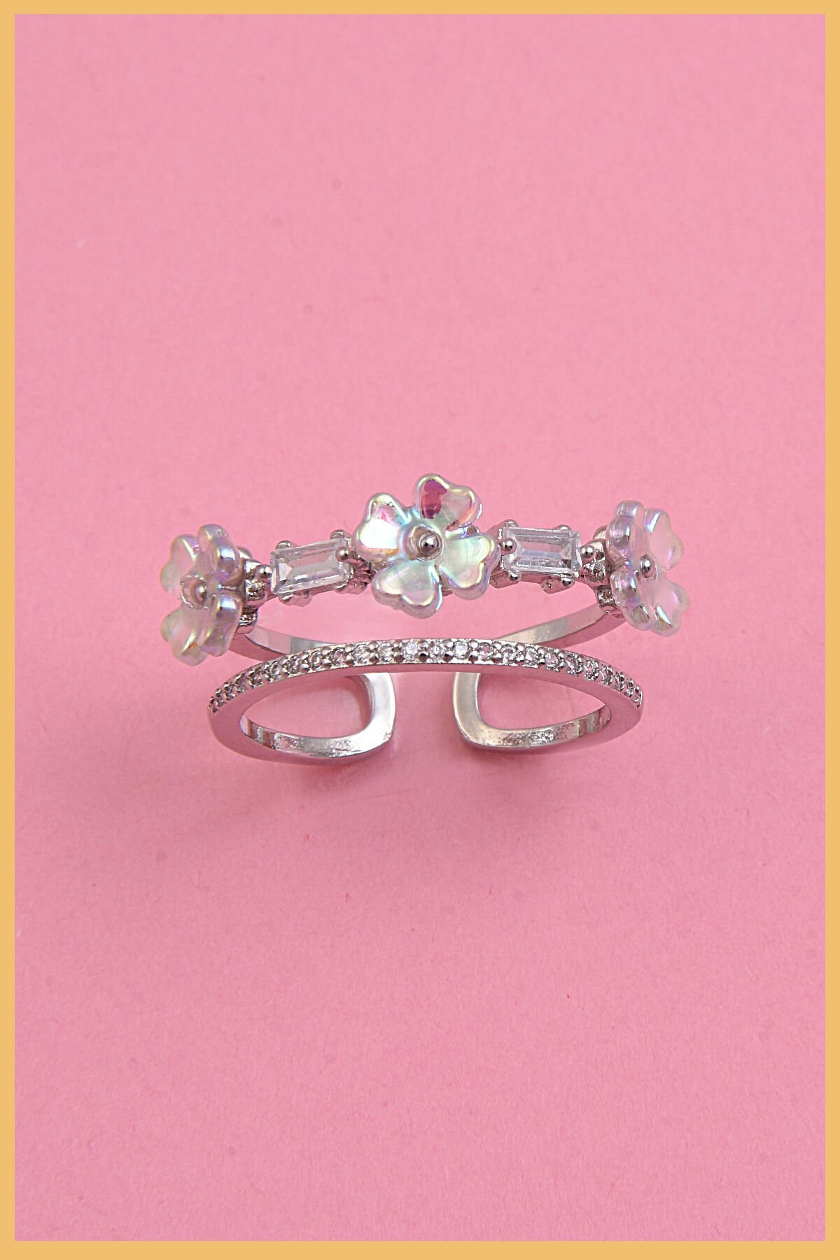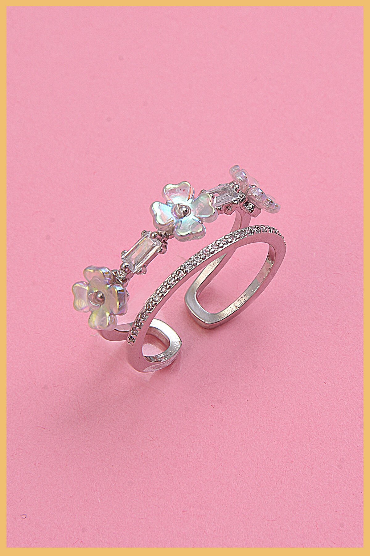Kadın 925K Gümüş Kaplama Zirkon&Sedef Taşlı Çiçek Motifli Ayarlanabilir Çelik Yüzük (Exclusive)