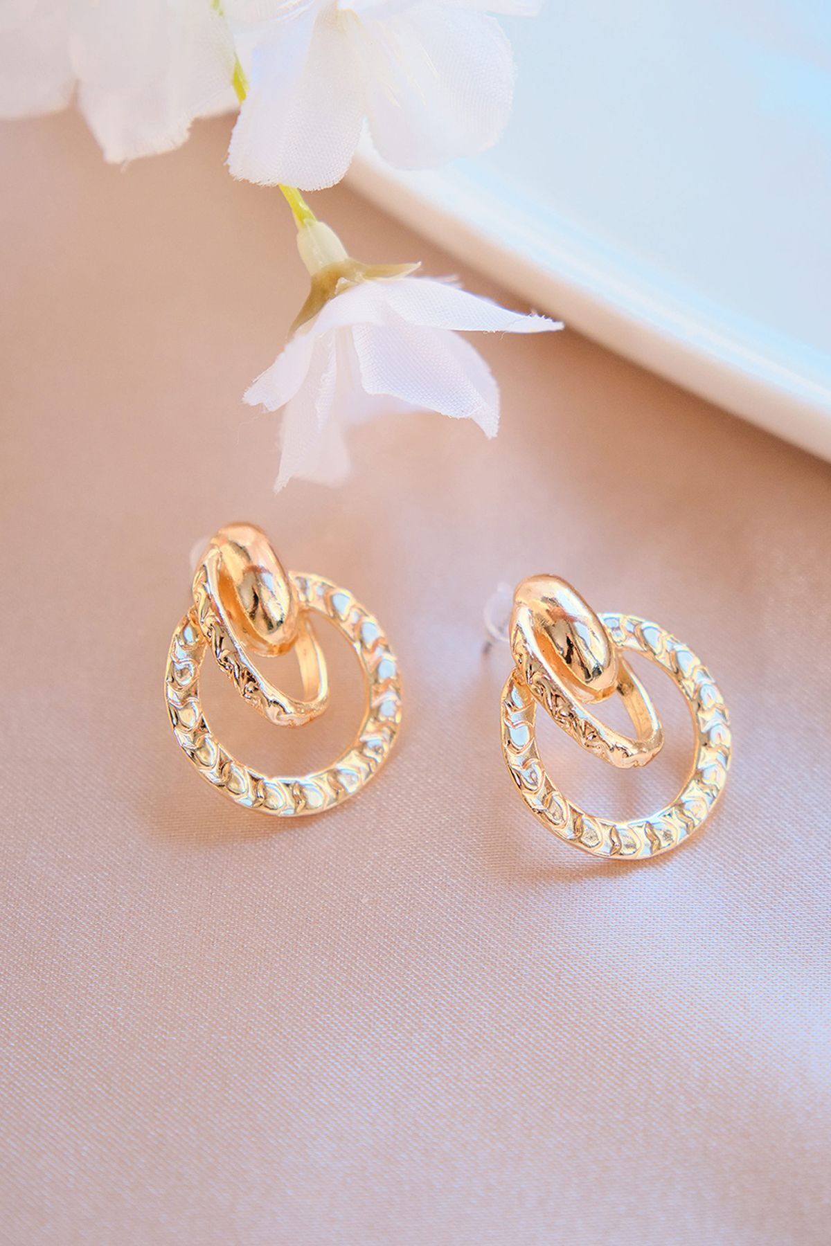Kadın Gold Çizgili Iç Içe Halka Küpe Seti