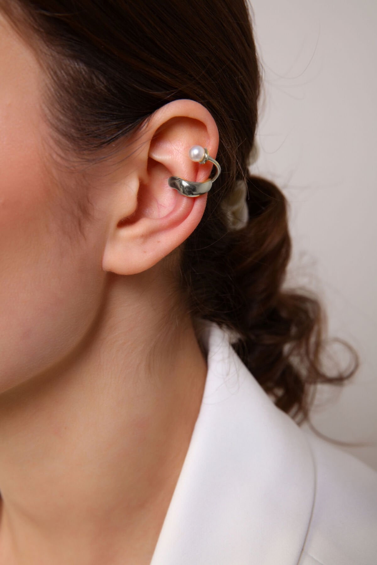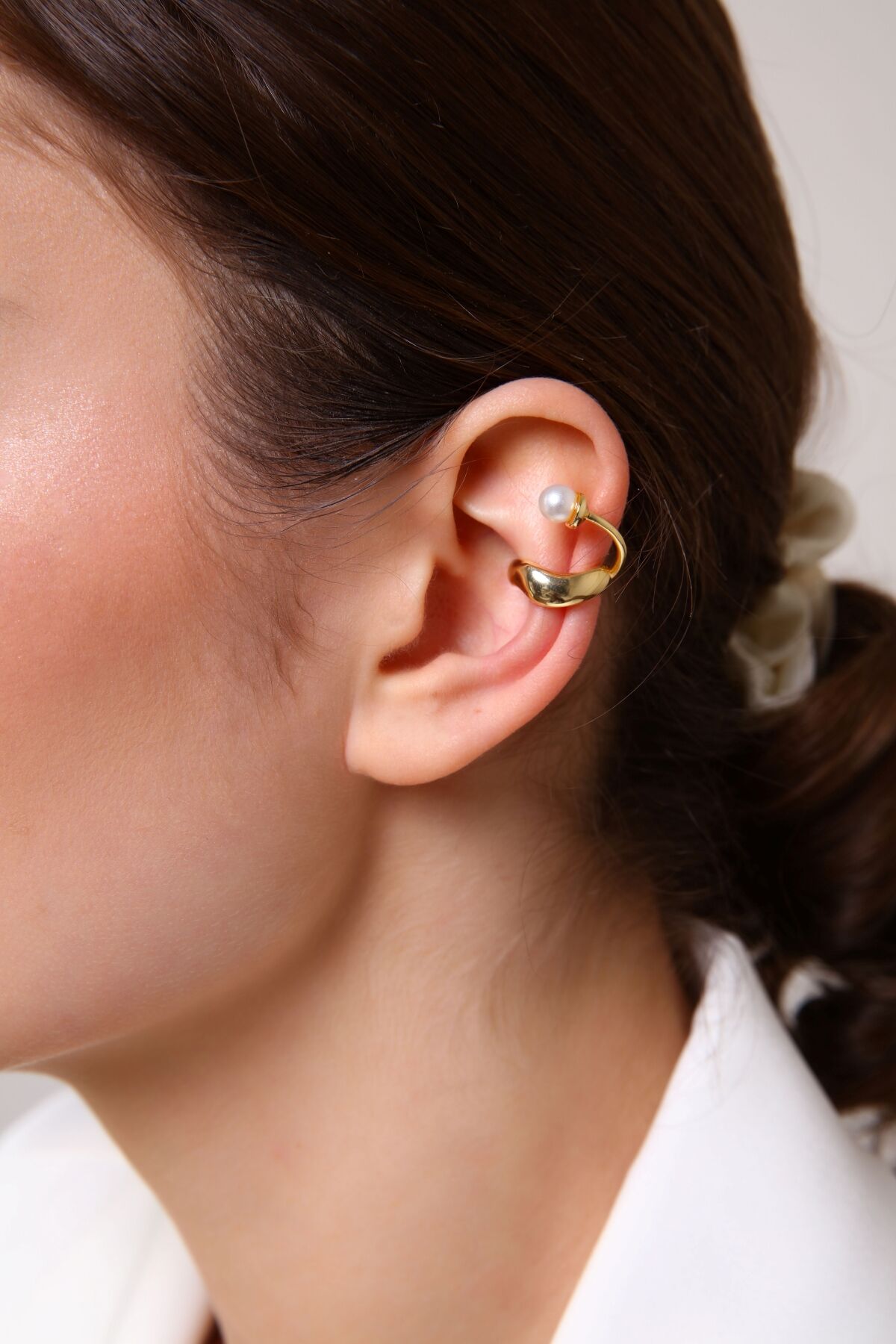 İncili kıkırdak küpe, sıkıştırmalı gold küpe, deliksiz ear cuff, altın kaplama inci takı, ayarlanabilir kıkırdak küpesi, antialerjik kıkırdak aksesuarı, şık kadın takıları, Aurrari özel tasarım.