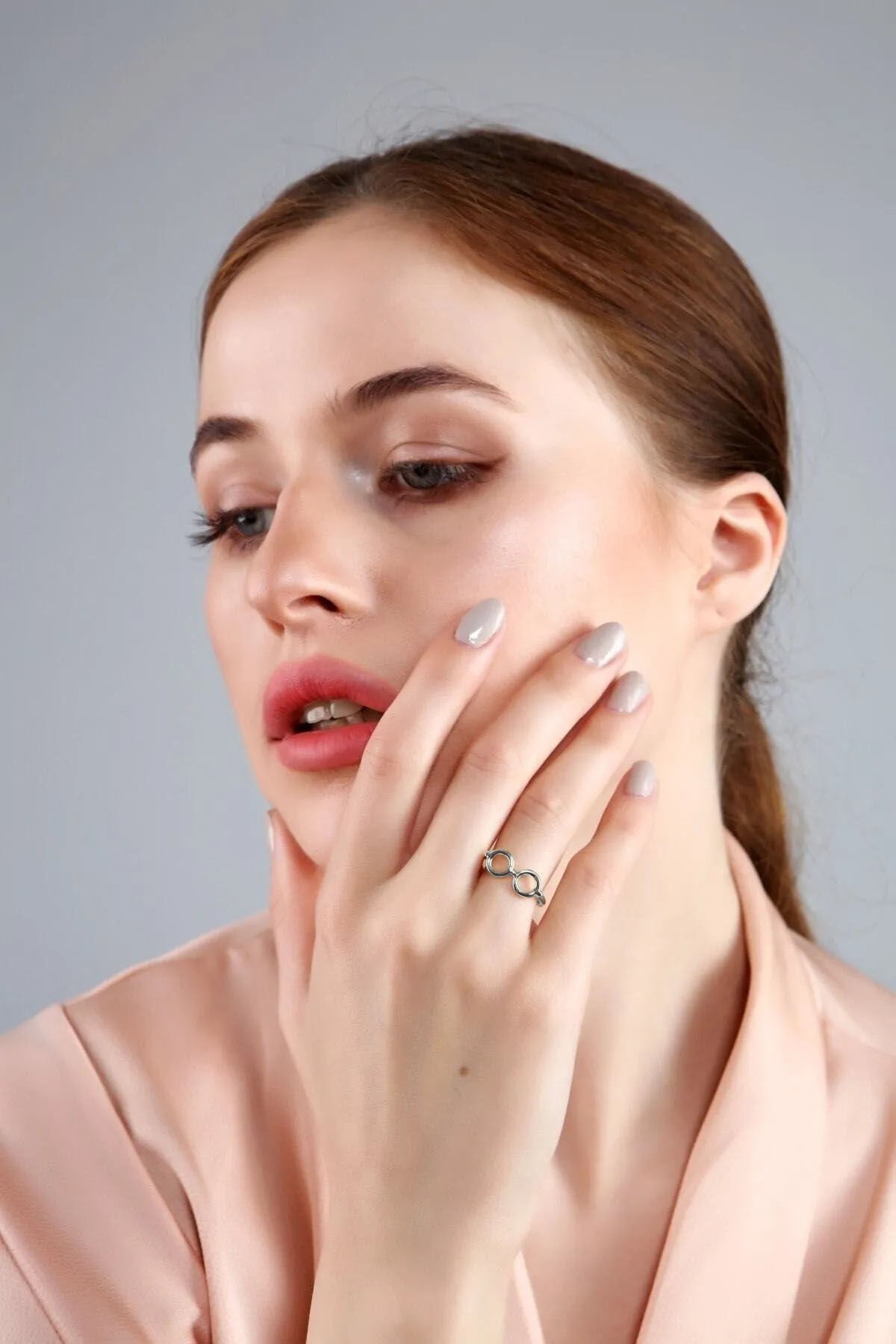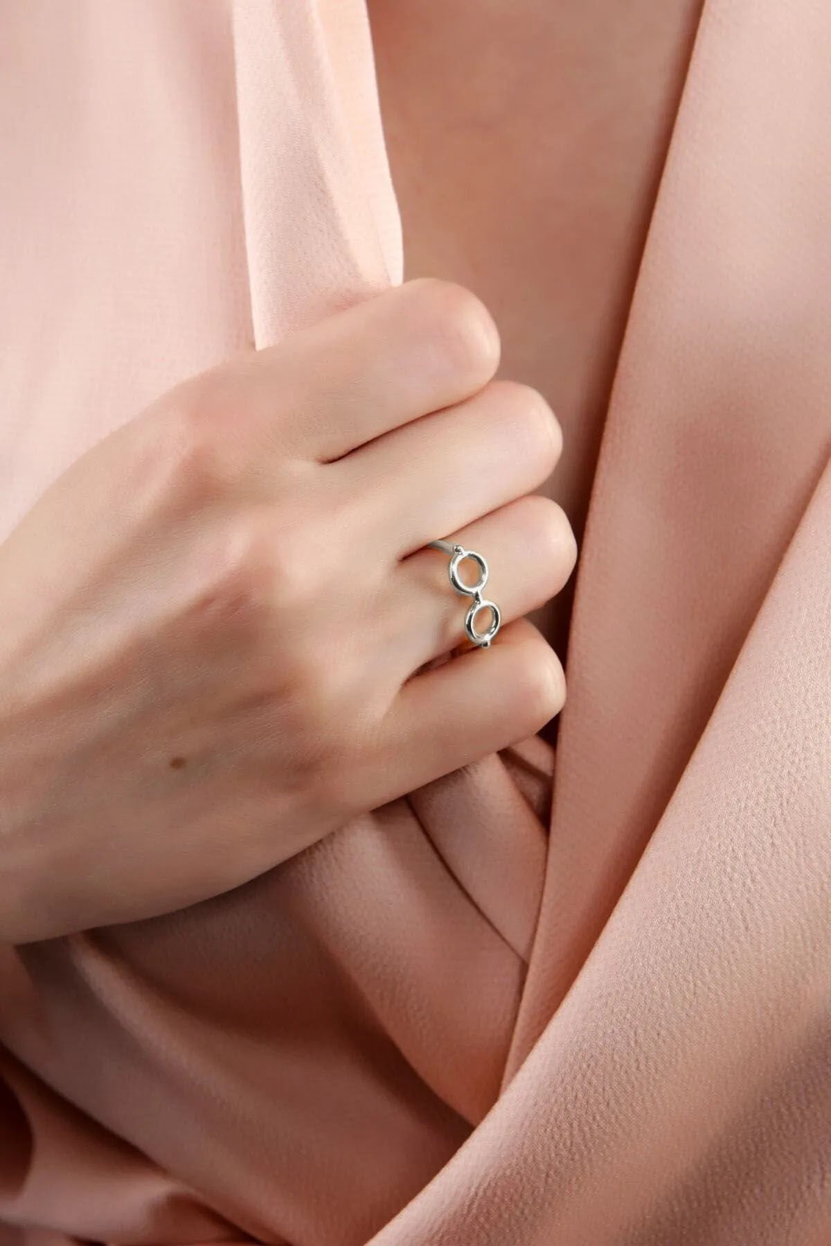 Bu gözlük şekilli yüzüğü, Aurrari’nin Silver Pembe Doğal Taşlı Yonca Şahmeranı ile bir arada kullanarak gümüşün modern gücünü ellerinizde toplayabilir; sade bir beyaz gömlek ve jean kombinine entelektüel bir derinlik katabilirsiniz.