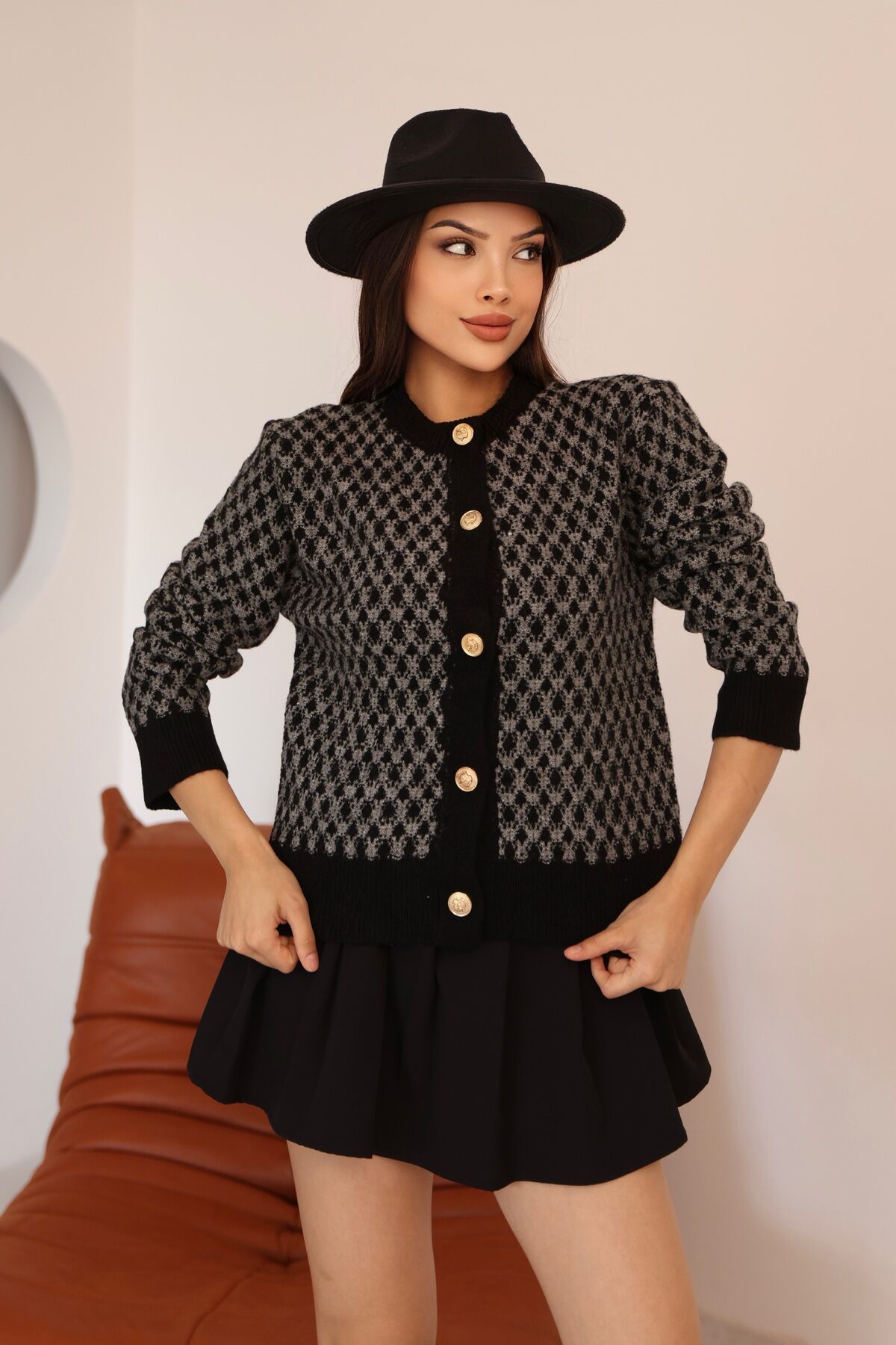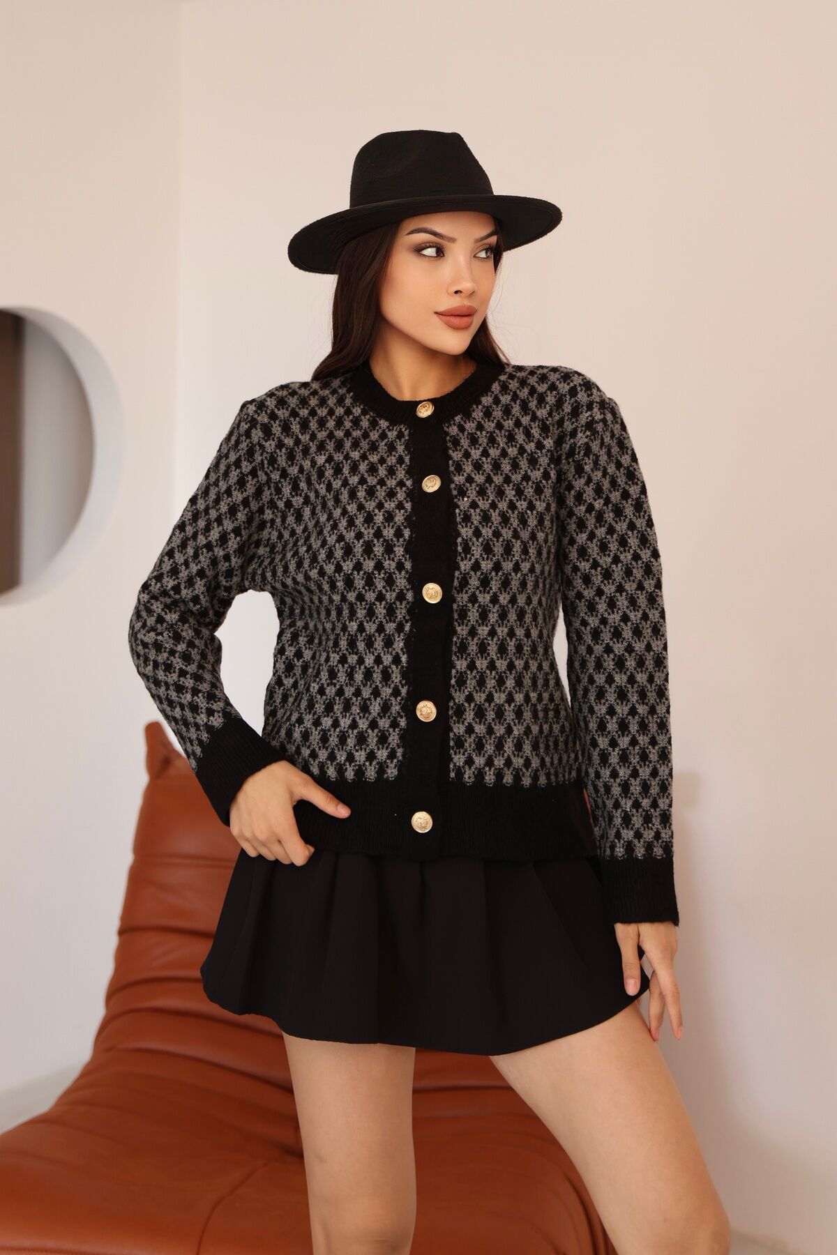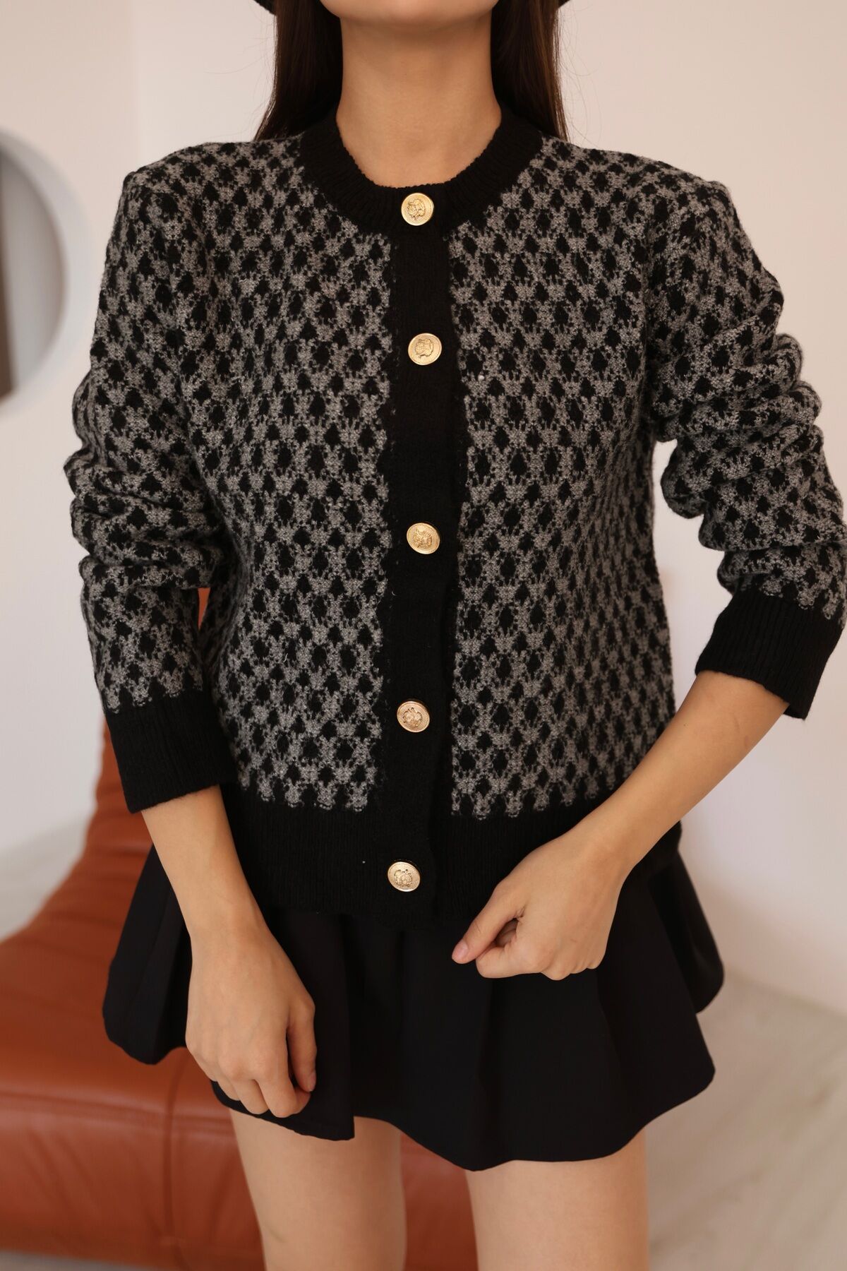 Kadın Siyah Gri Bisiklet Yaka Gold Düğme Detaylı Desenli Triko Hırka – Premium Örme Ceket
