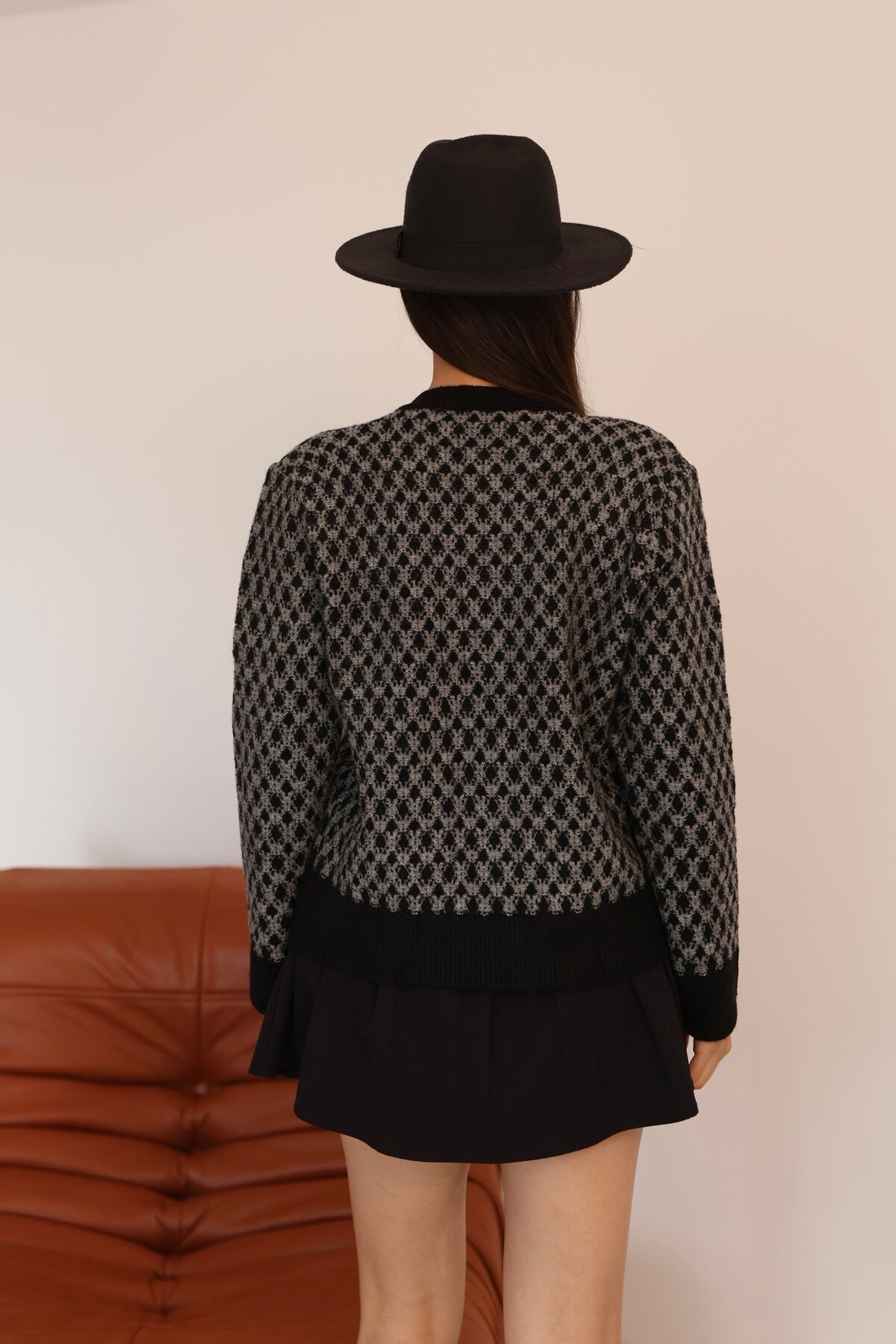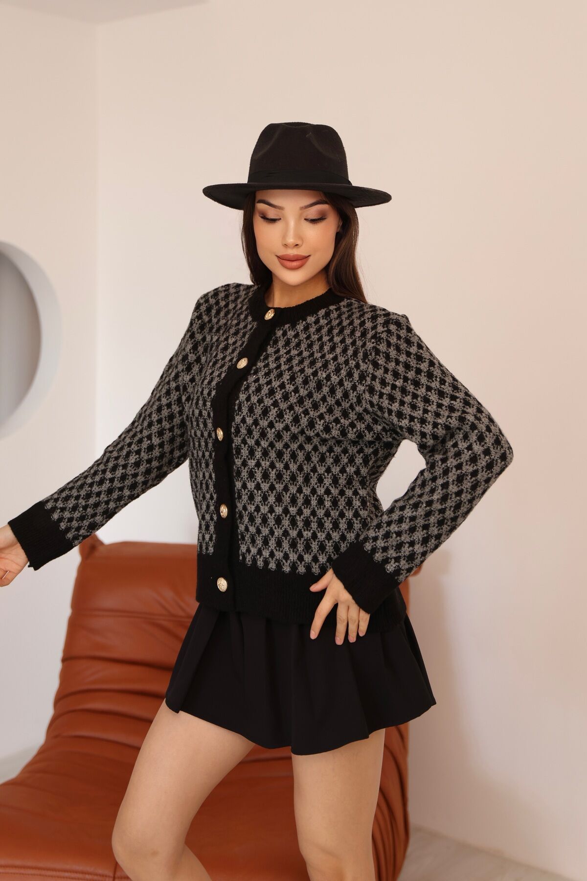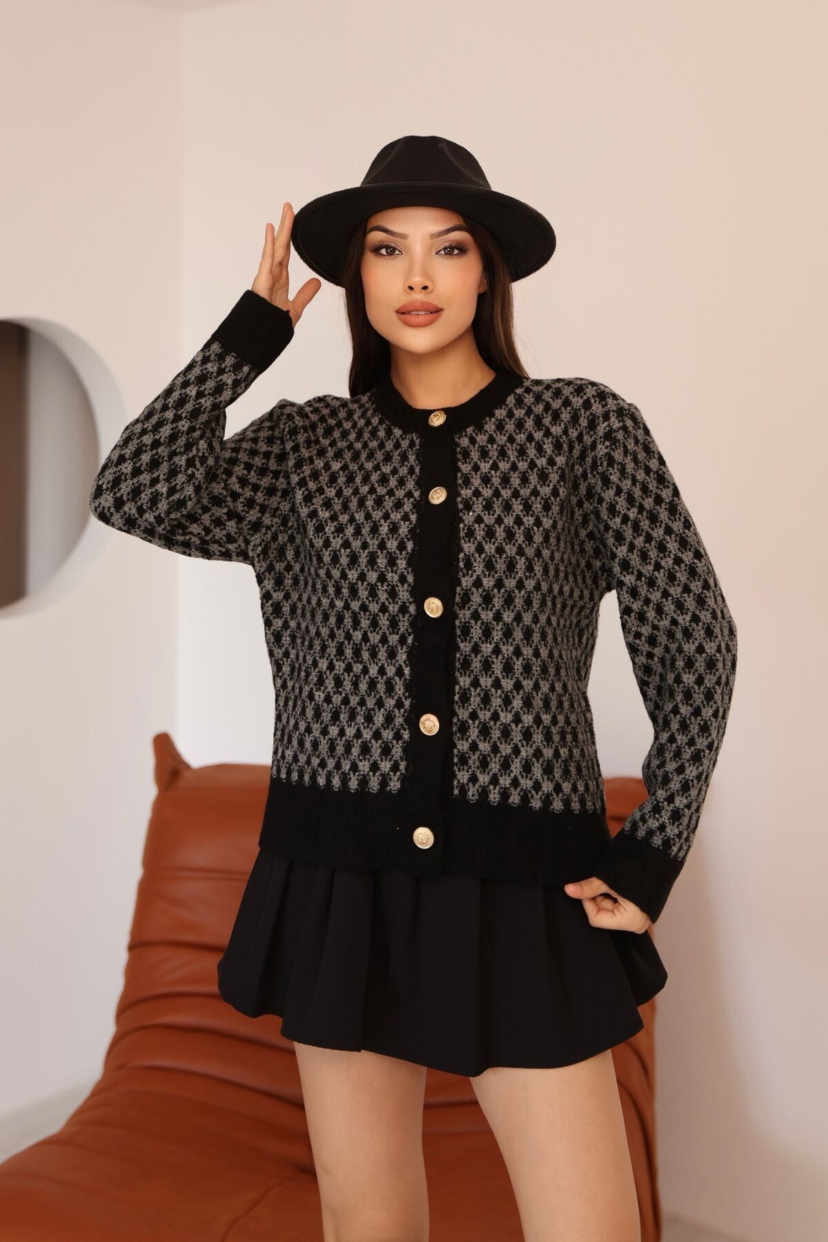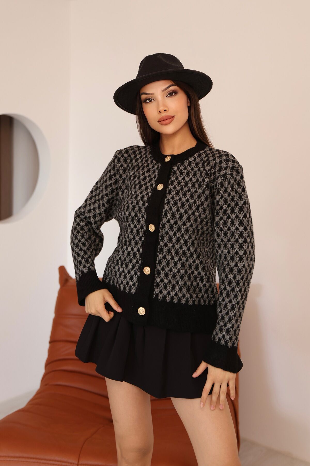 Kadın Siyah Gri Bisiklet Yaka Gold Düğme Detaylı Desenli Triko Hırka – Premium Örme Ceket