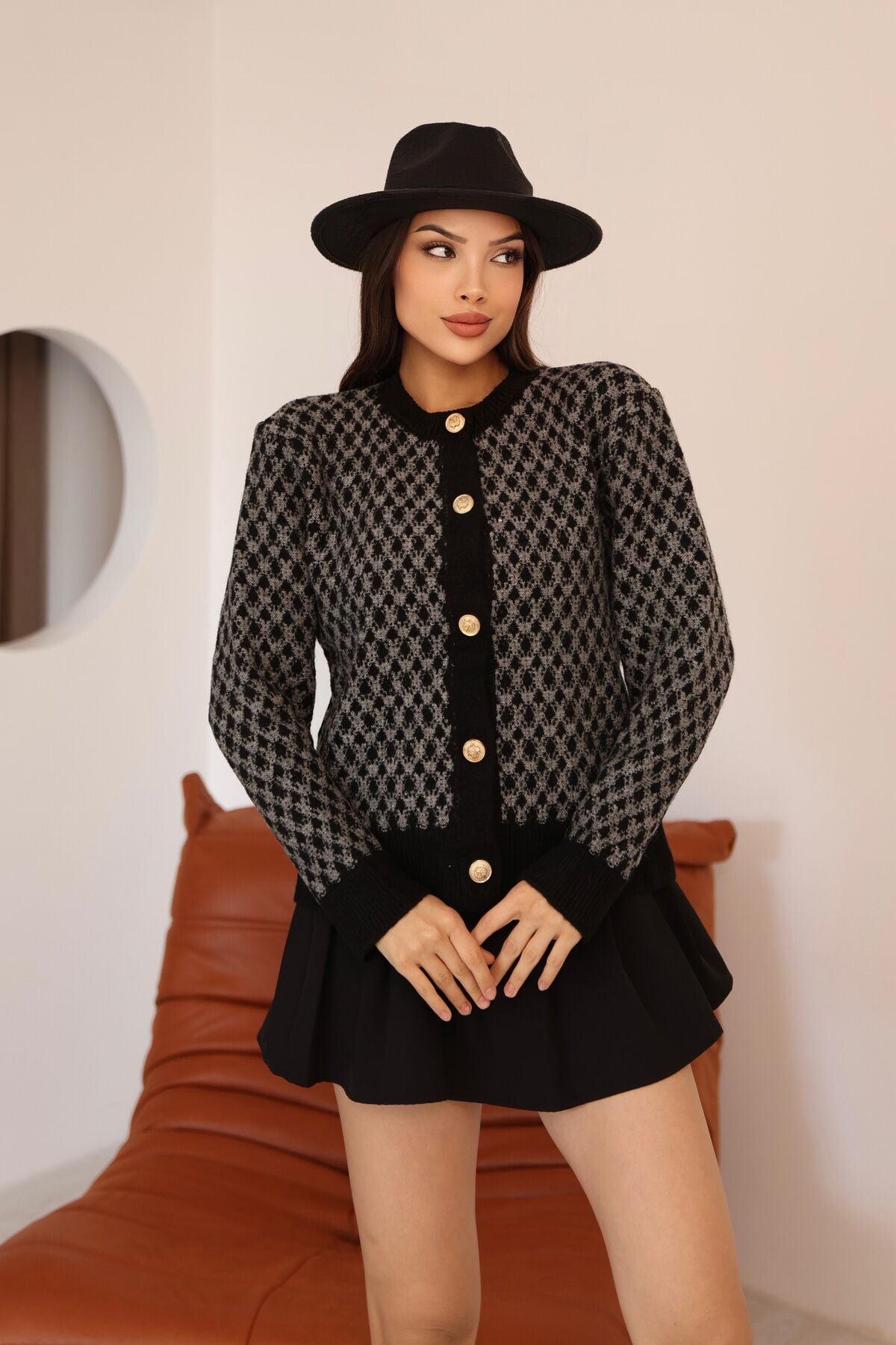 Zamansız desenlerin lüks detaylarla buluştuğu Aurrari koleksiyonunun bu özel parçası, gardırobunuza sofistike bir dokunuş katıyor. Siyah ve grinin ağırbaşlı uyumu, özel tasarım gold düğmelerle birleşerek hırka konforunu ceket şıklığına taşıyor. Hem ofis stilinizde profesyonel bir duruş sergilemek hem de günlük kombinlerinize feminen bir zarafet katmak için tasarlanan bu desenli triko, yumuşak dokusuyla sizi sarmalarken estetik duruşuyla tüm bakışları üzerinize çekecek.