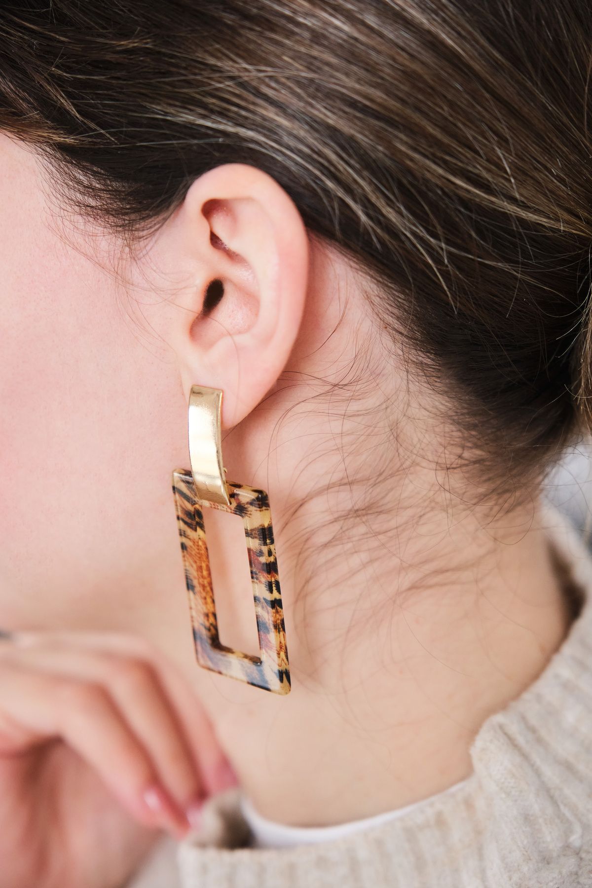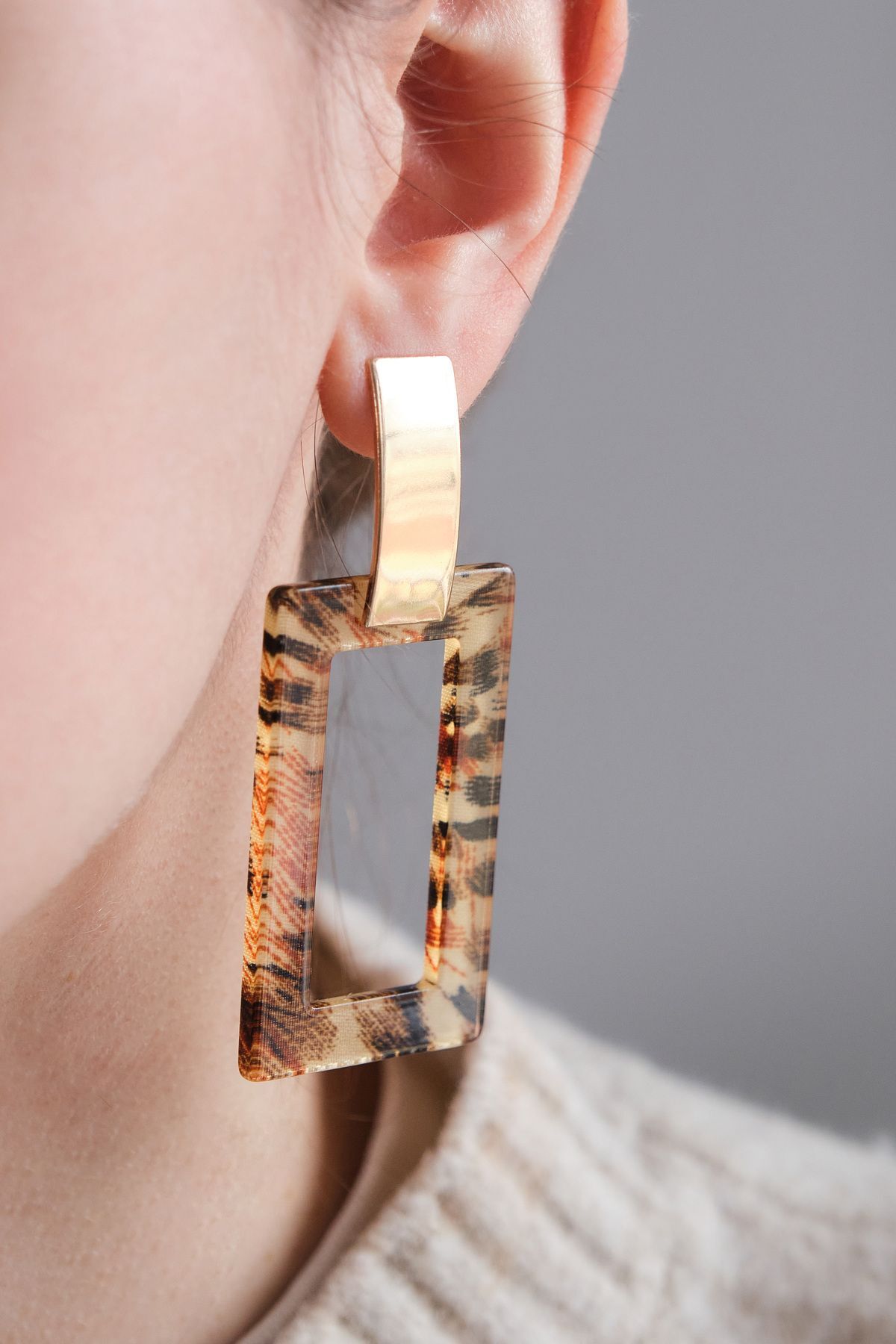 - Zarif leopar desenli tasarımıyla dikkat çeken bu küpeler, şıklığınızı tamamlayacak bir aksesuardır.; - Altın kaplama malzemesi ile hem kaliteyi hem de estetiği bir arada sunar.; - Epoksi materyal kullanımı sayesinde dayanıklılık ve uzun ömürlü kullanım vaat eder.; - Özel kutusuyla gelen bu küpeler, hediye olarak da idealdir.; - Kadın ve kızlar için özel olarak tasarlanmış olup, her türlü kıyafetle uyum sağlar.; - Pirinç materyali sayesinde alerji yapma riski minimize edilir ve cildinizle dosttur.; - Çivi modeli ile modern ve trend bir görünüm sunarken, her türden kulağa mükemmel uyum sağlar.; - Taşsız yapısıyla minimalist ve sade tasarım severler için idealdir.