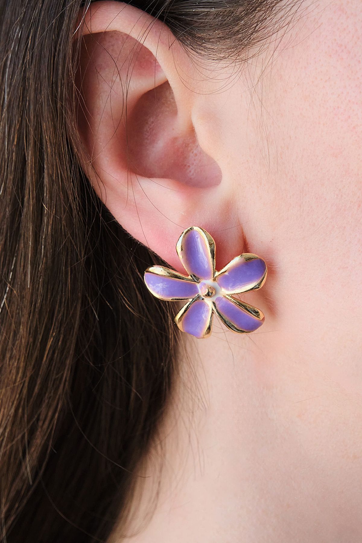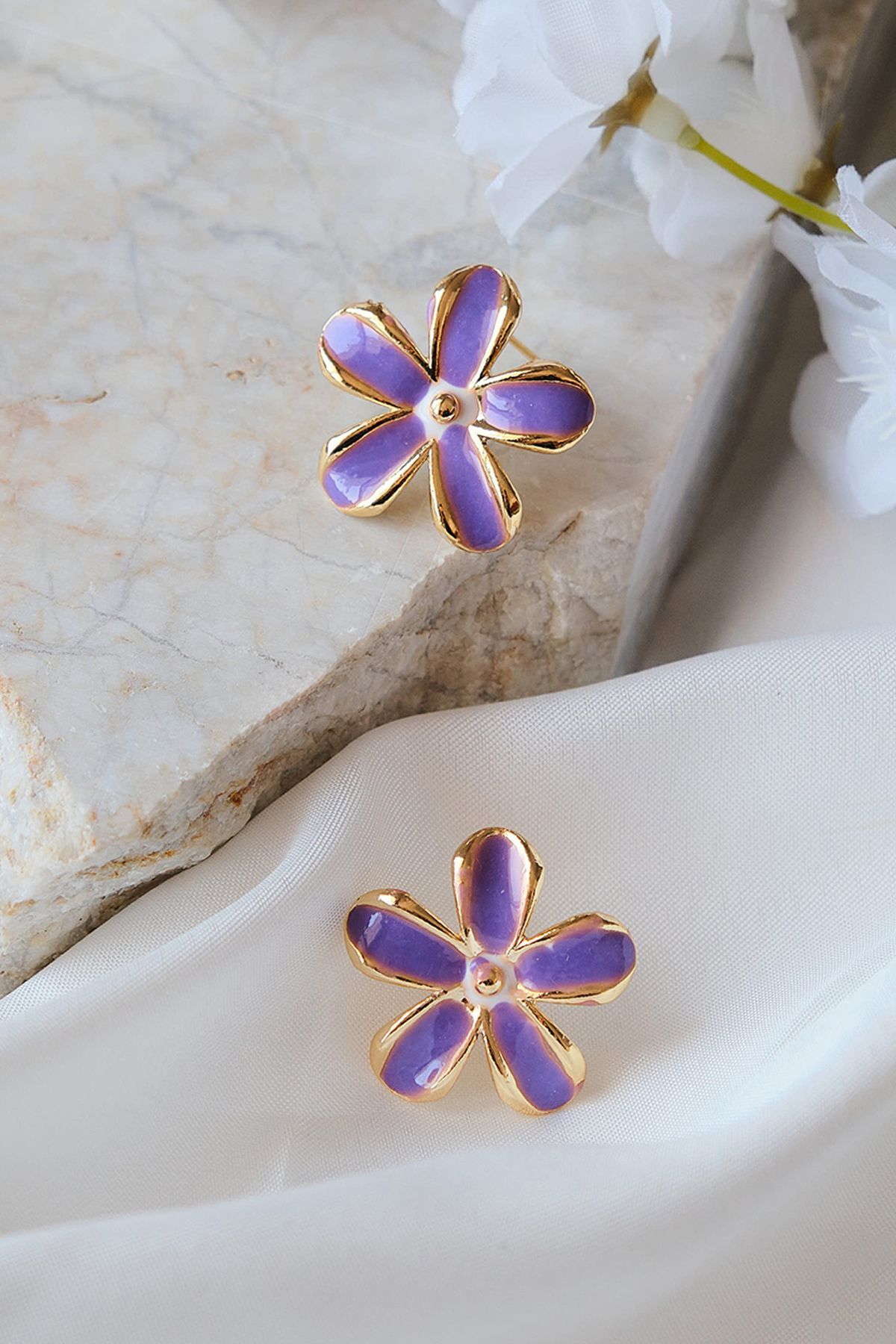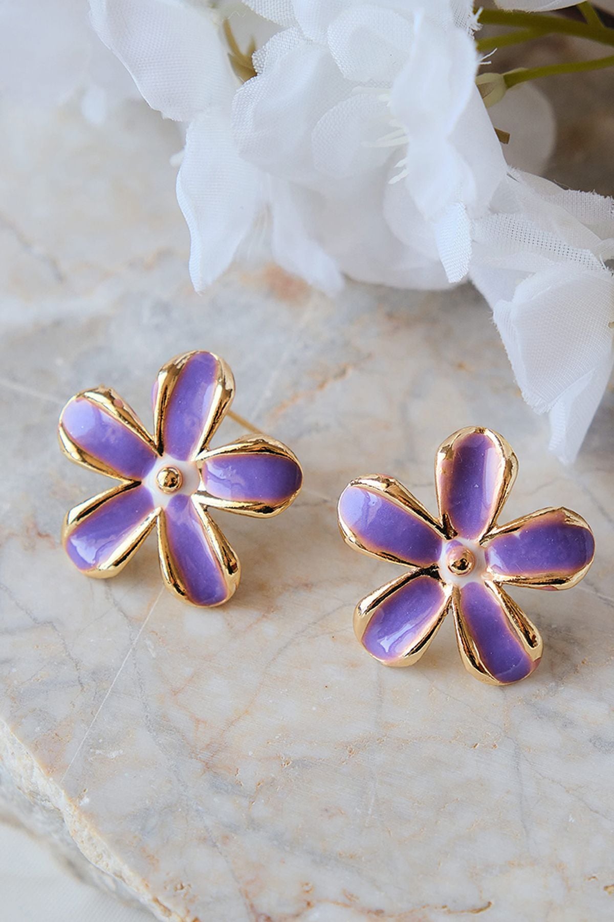 Kadın Altın Kaplama Mor ve Beyaz Mineli Papatya Küpe - Modern Romantik Çivi Model Çiçekli Küpe