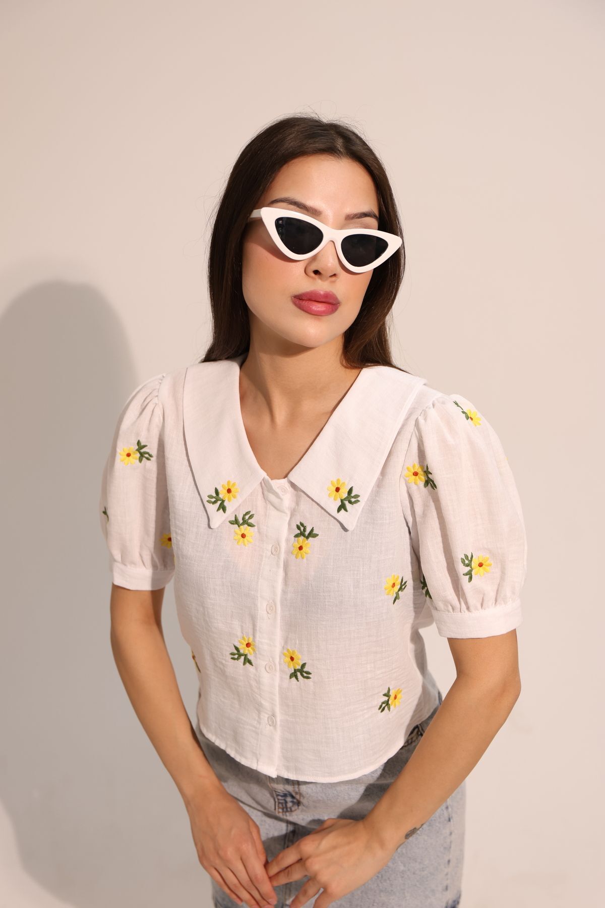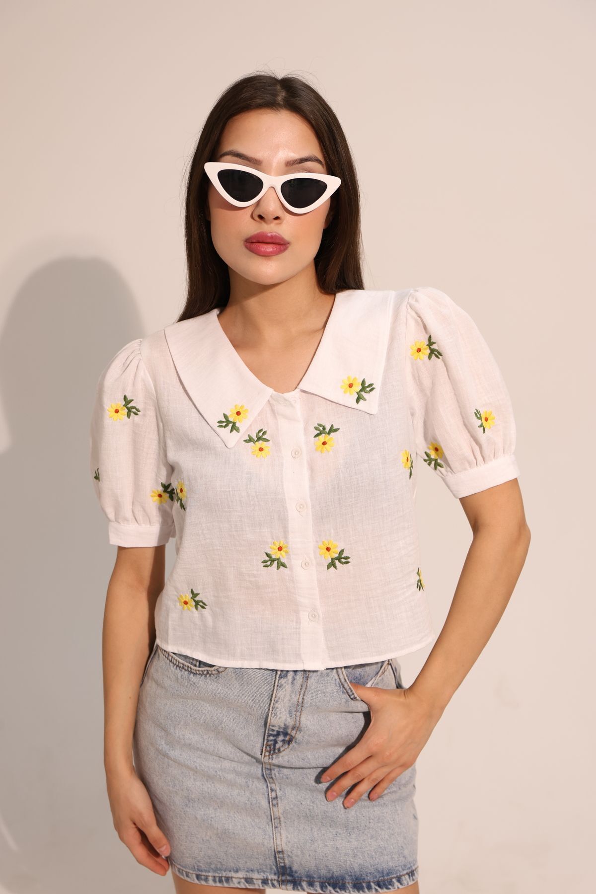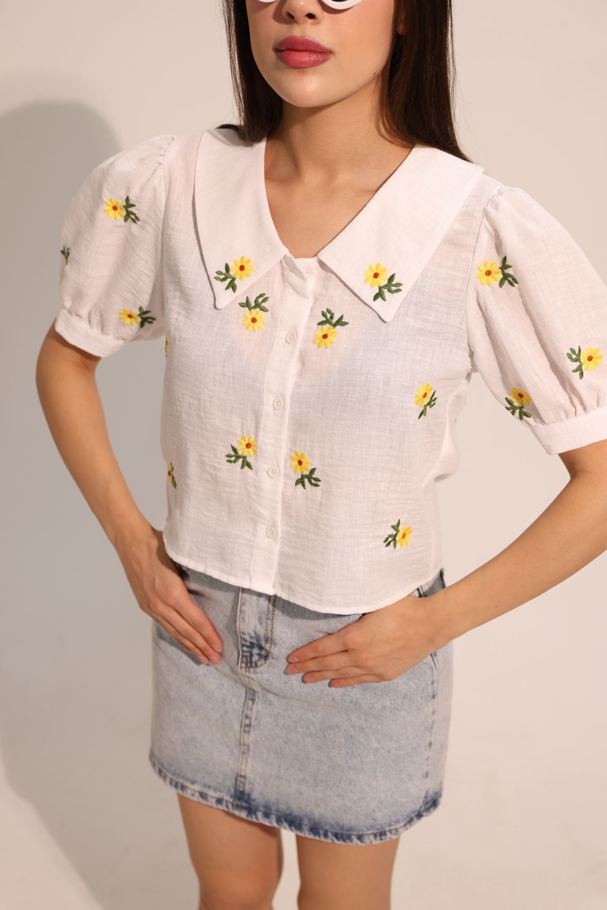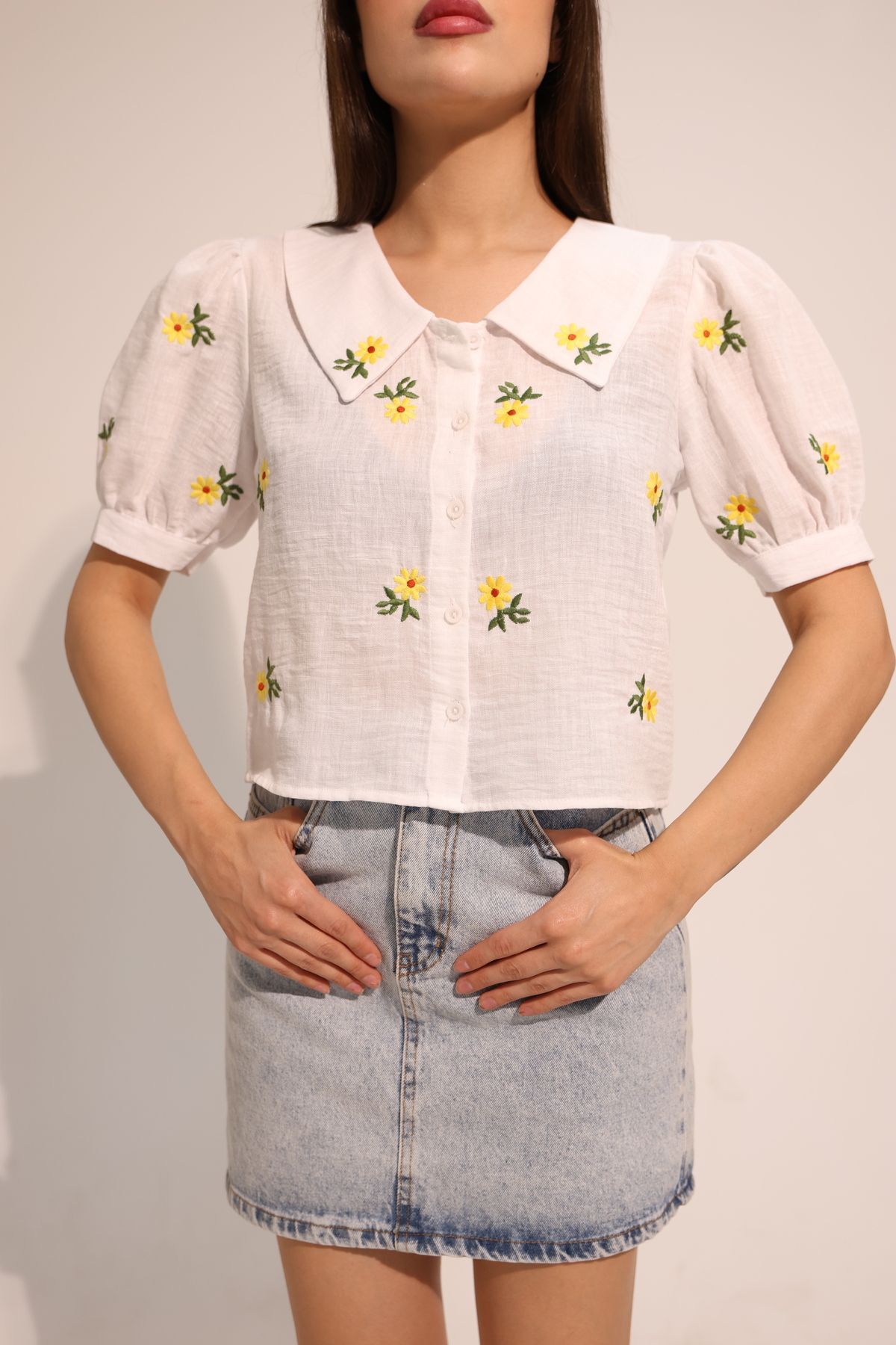 Papatya Desenli Beyaz Kısa Kollu Keten Gömlek