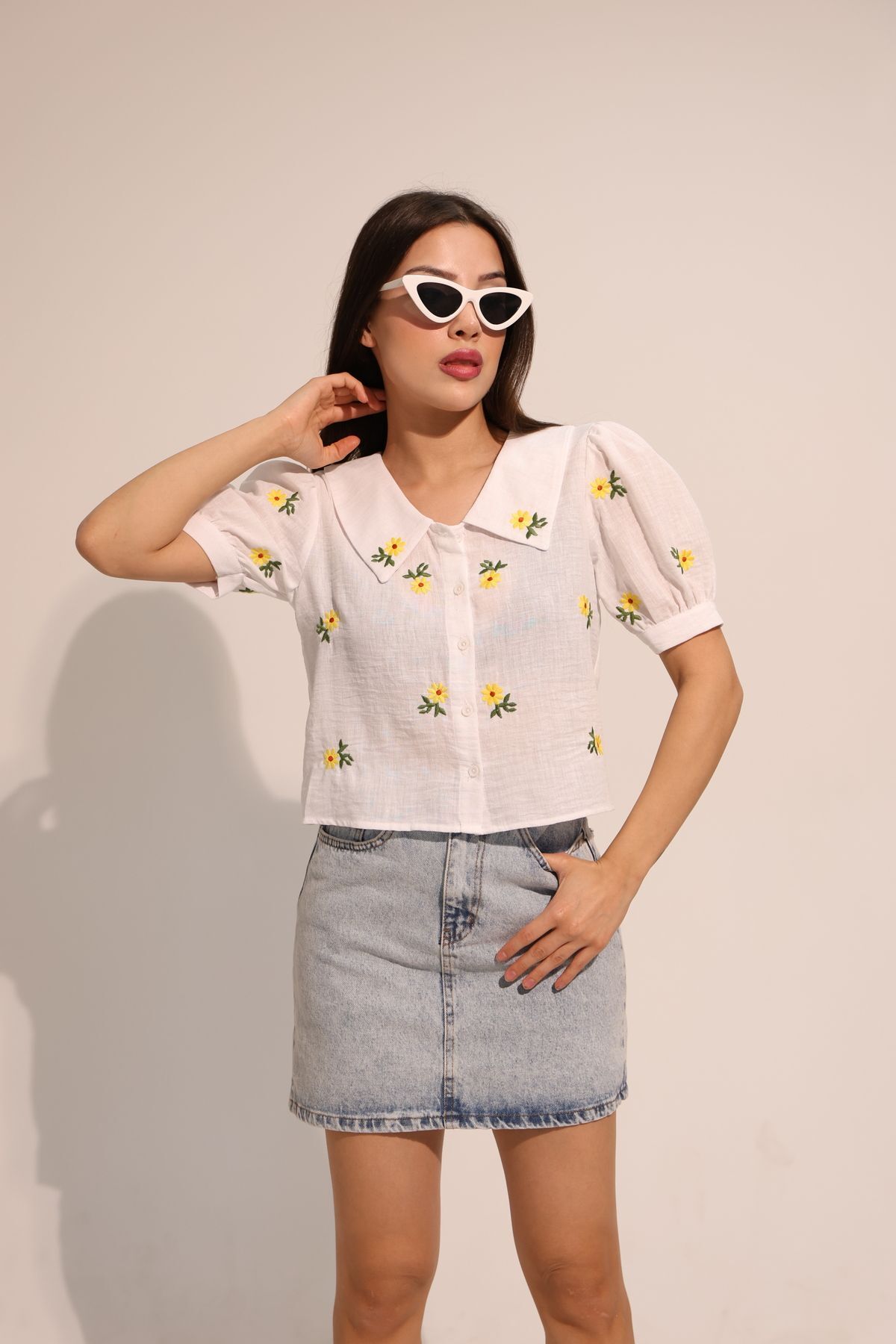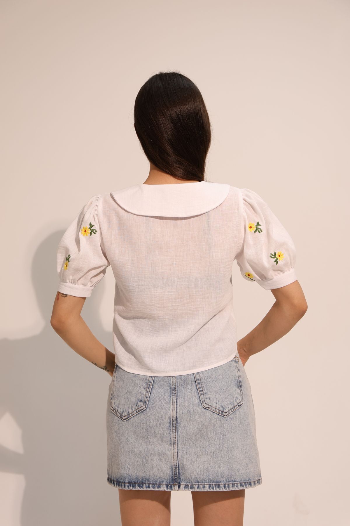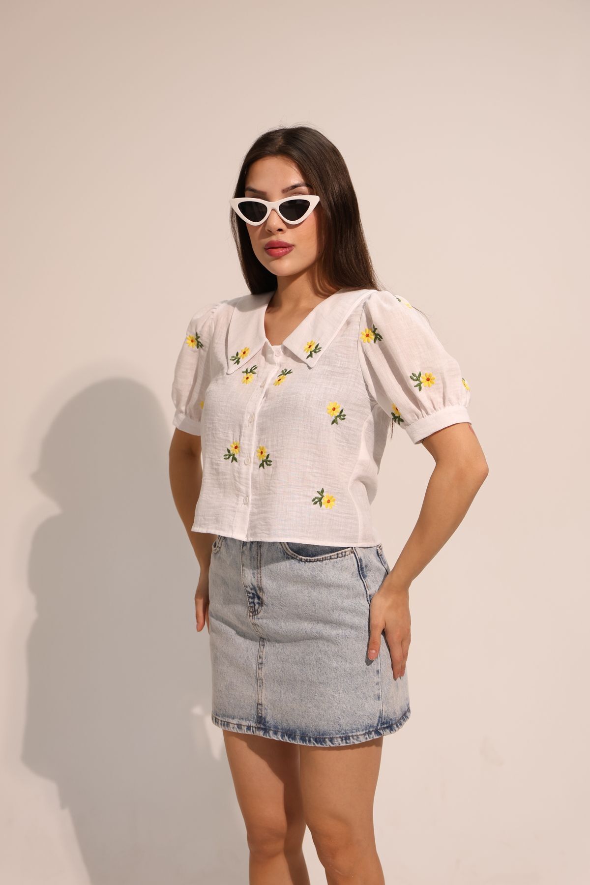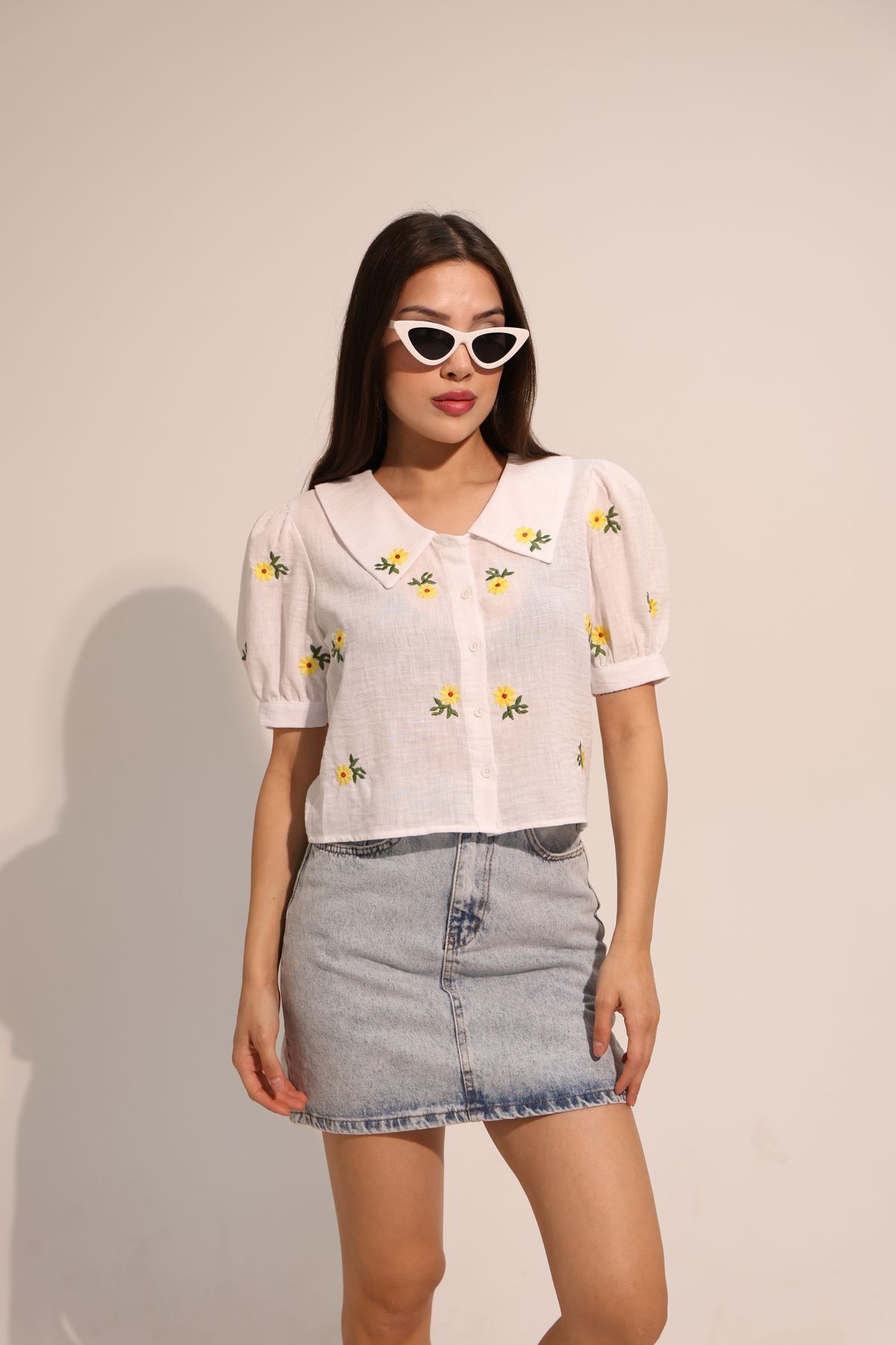 Papatya Desenli Beyaz Kısa Kollu Keten Gömlek