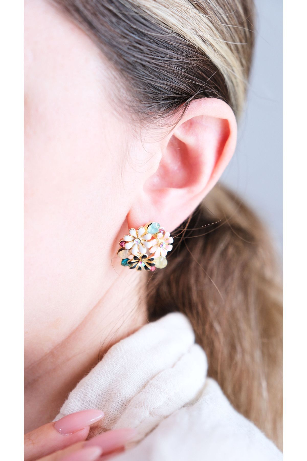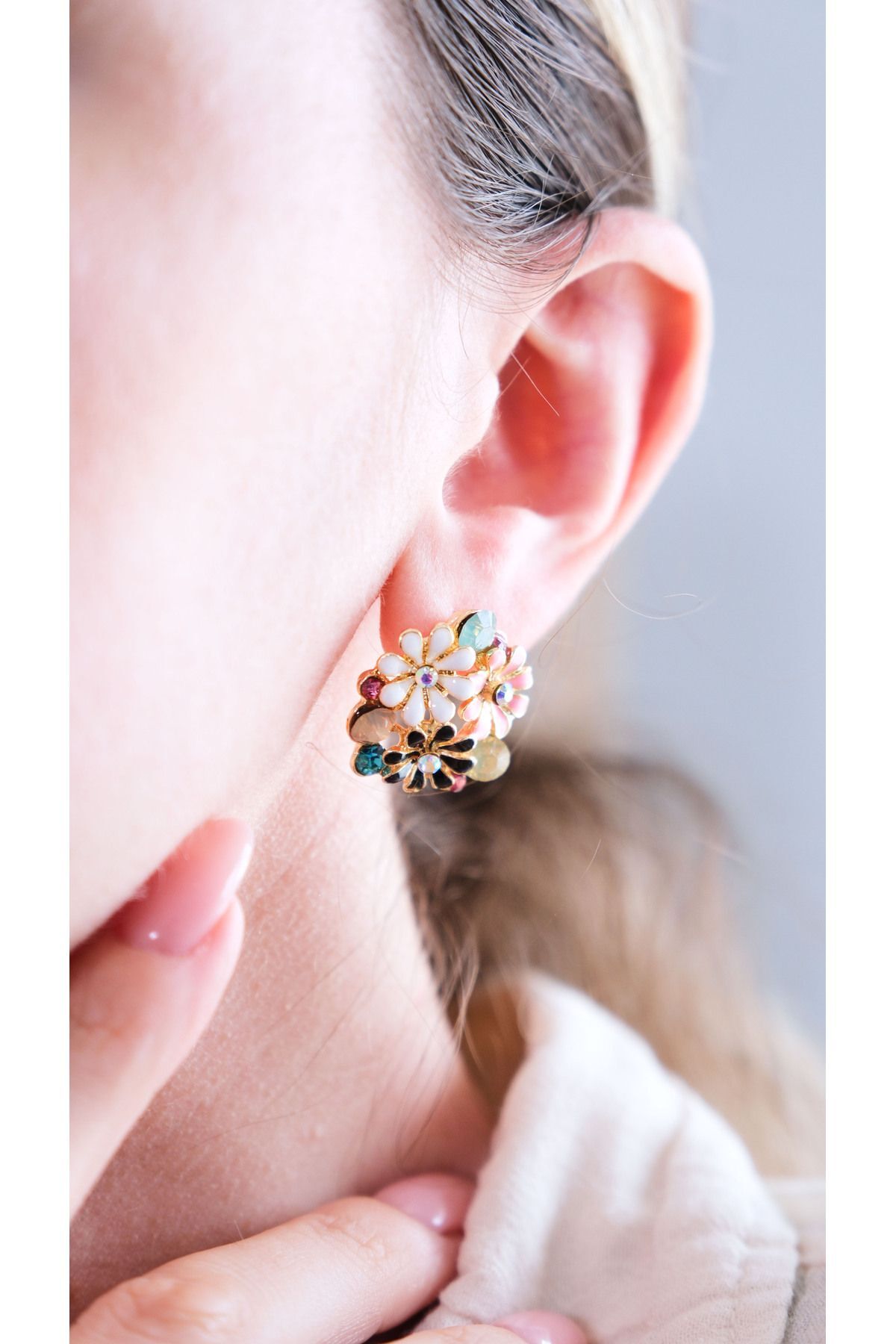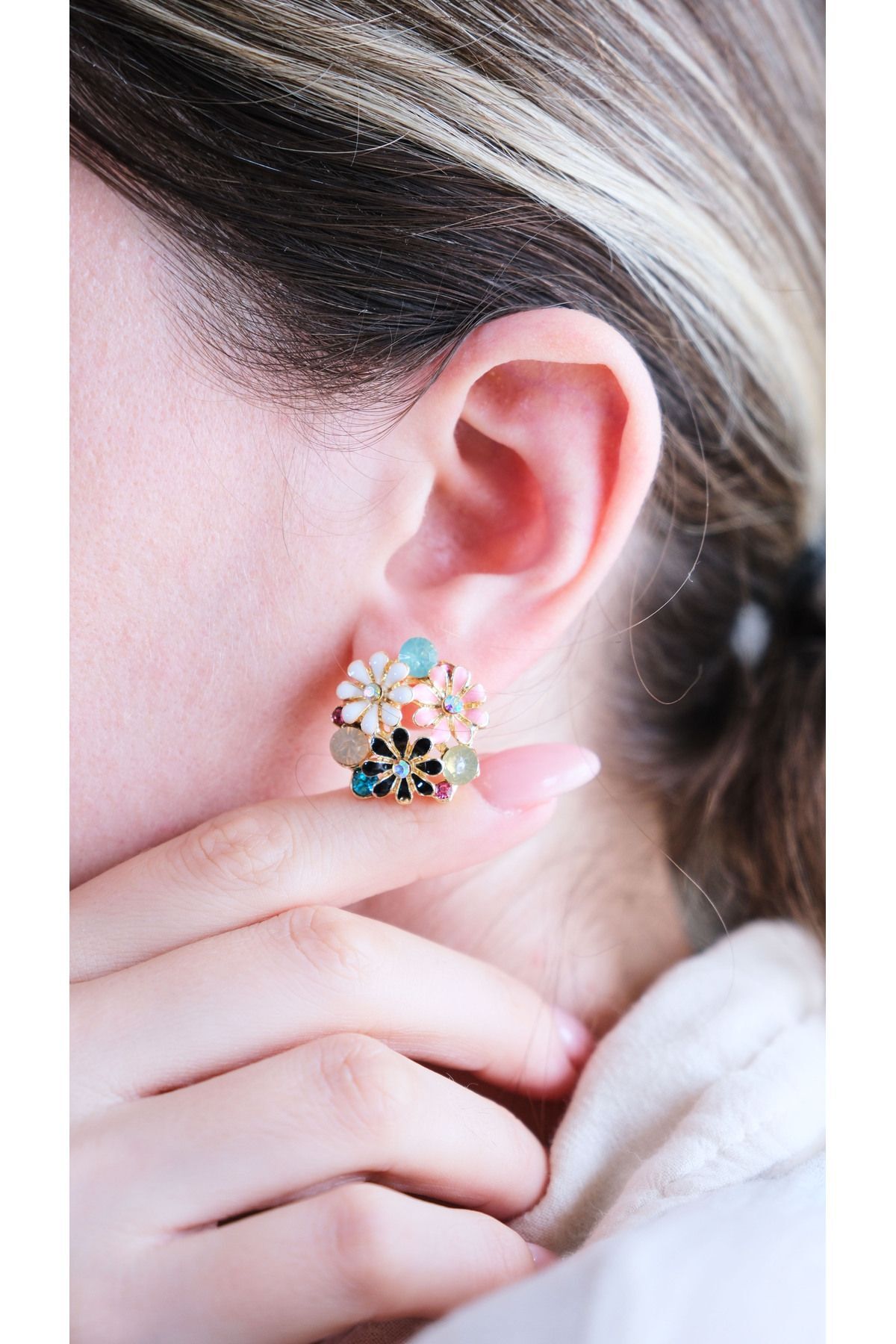 Bu göz alıcı küpe, zarafeti ve canlılığı bir araya getiriyor. Üzerinde farklı renklerden oluşan üç adet papatya bulunan bu küpe, her ortamda dikkatleri üzerine çeker. Papatyaların ortasında yer alan zirkon taşlar, küpeye ışıltı katarak sofistike bir hava yaratır. Altın kaplama yüzeyi ile şıklığı tamamlayan bu küpe, hem günlük kullanım hem de özel günler için mükemmel bir seçenektir.