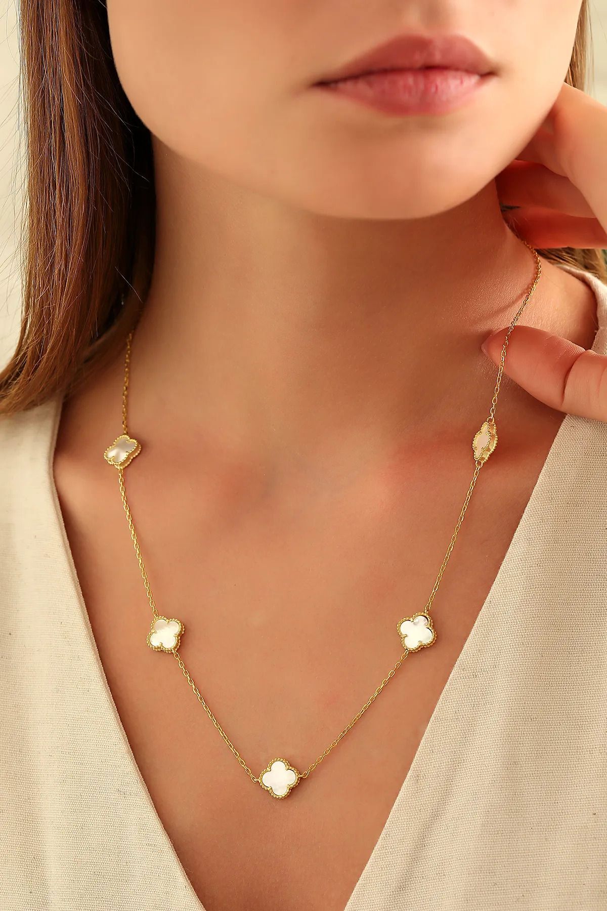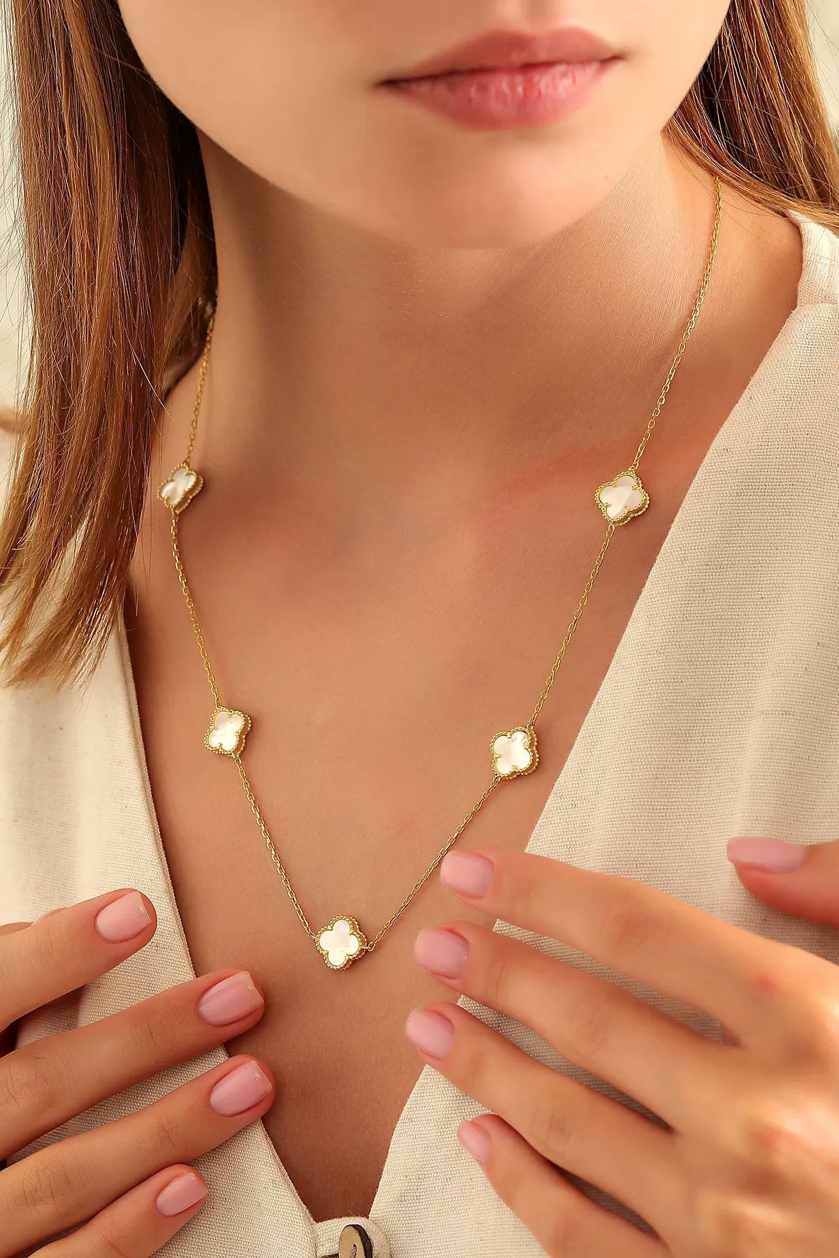 - Çelik malzeme kullanımı sayesinde uzun ömürlü ve dayanıklı bir aksesuar deneyimi sunar.; - Sedef rengi altın kaplama detayları ile göz alıcı bir parlaklık ve şıklık katar.; - Yetişkin yaş grubuna hitap eden tasarımıyla herkesin tarzına uyum sağlar.; - Çin menşeli üretim süreciyle uluslararası kalite standartlarına sahiptir.; - Doğal taş kullanımı, kolyeye doğal bir güzellik ve zarafet katarken aynı zamanda benzersiz bir görünüm sunar.; - Kadın ve kız çocukları için idealdir; hem günlük kullanım hem de özel günlerde tercih edilebilir.; - 2 yıl garanti süresi ile satın alma sonrasında da güvenle kullanabilirsiniz.