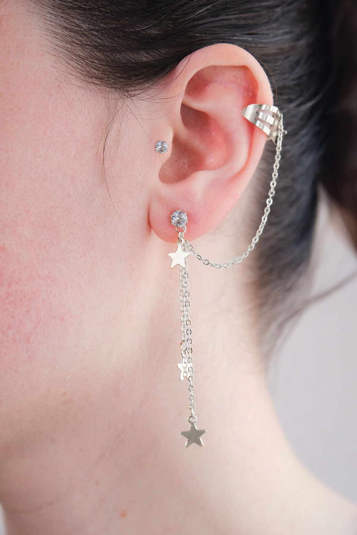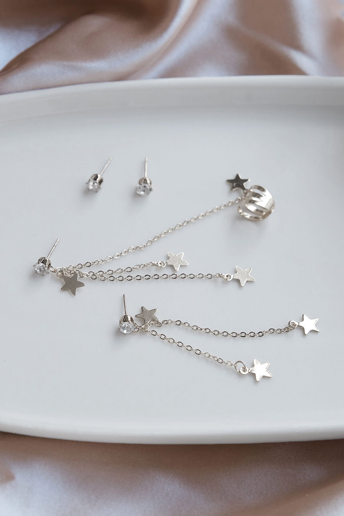 Silver Kıkırdak Ve Küpe Zirkon Taşlı Sallantılı Yıldız Küpe