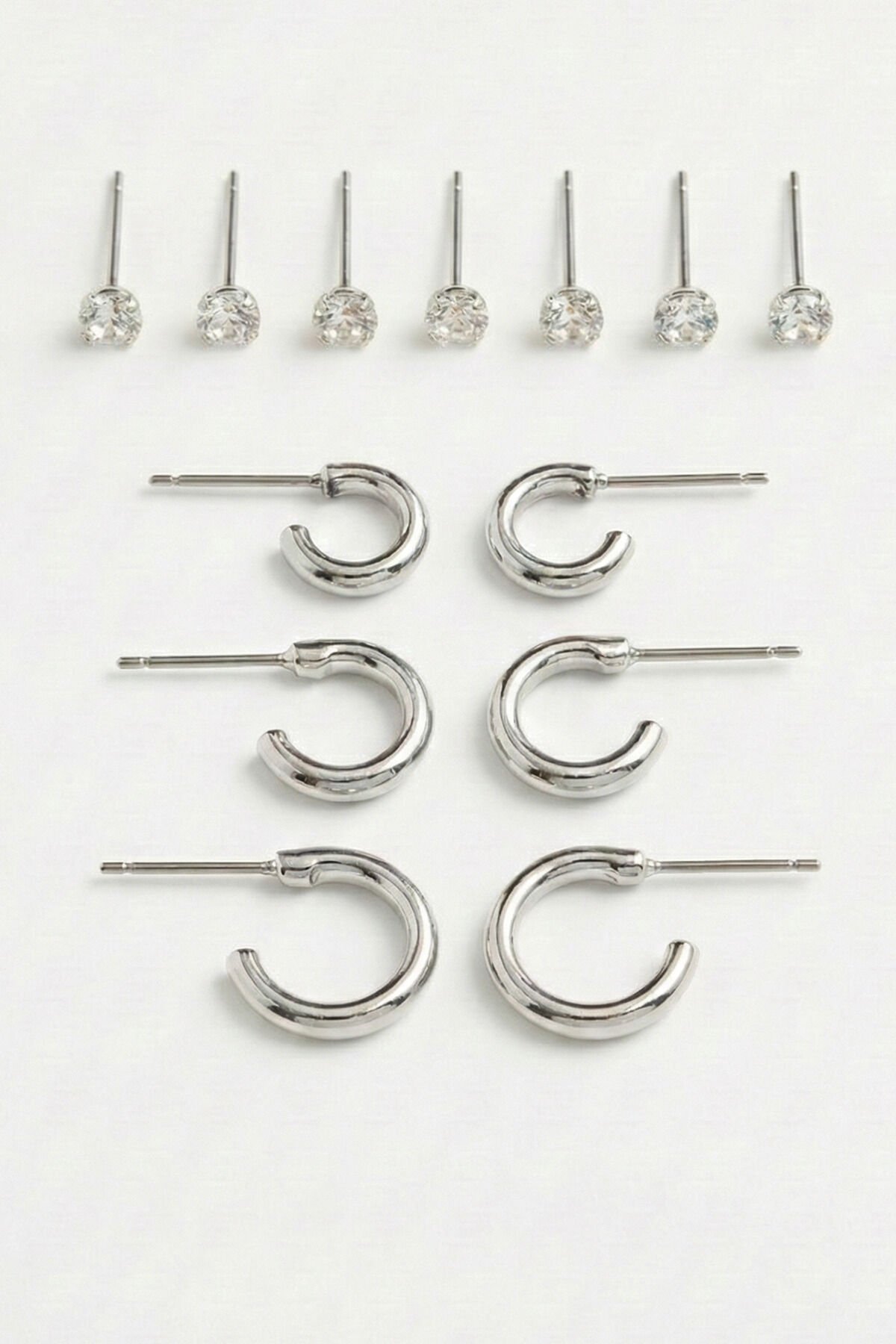 Gümüş renk küpe seti, çoklu halka küpe, zirkon taşlı küpe modelleri, mini halka küpe seti, yerli üretim takı, kadın küpe kombinleri, şık ve minimal aksesuar.