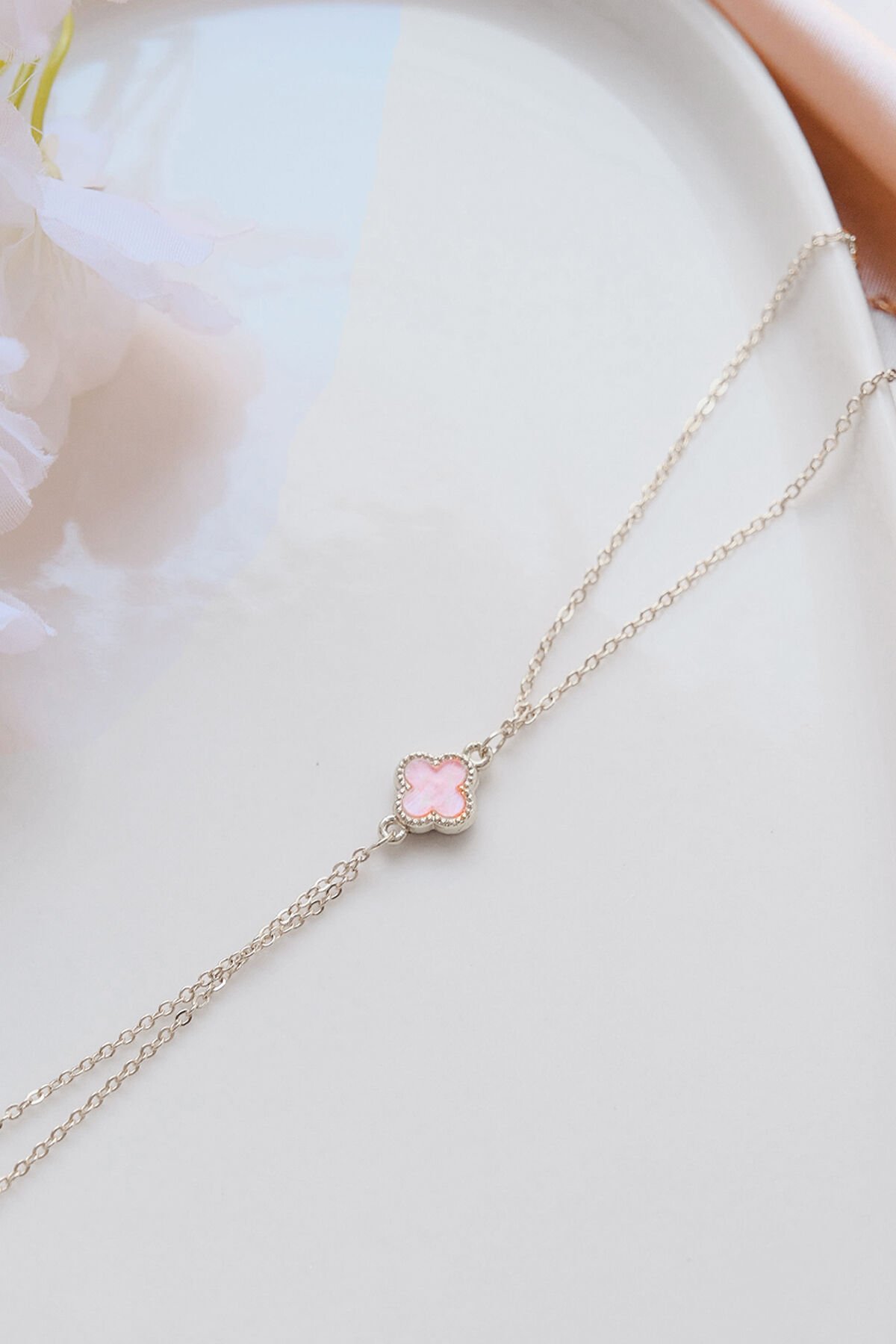 Aurrari Silver Pembe Doğal Taşlı Yonca Şahmeran - Gümüş Kaplama Ayarlanabilir El Bilekliği Aksesuarı