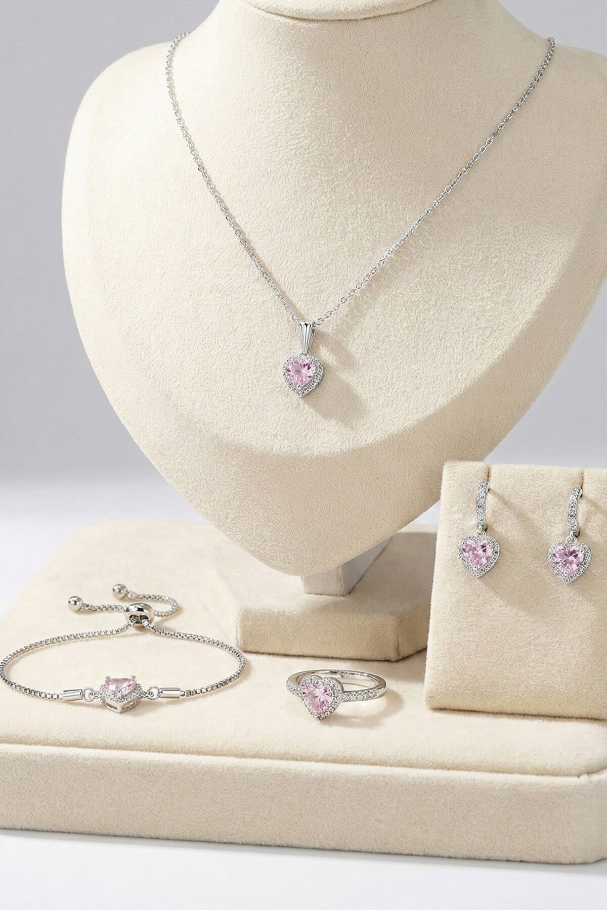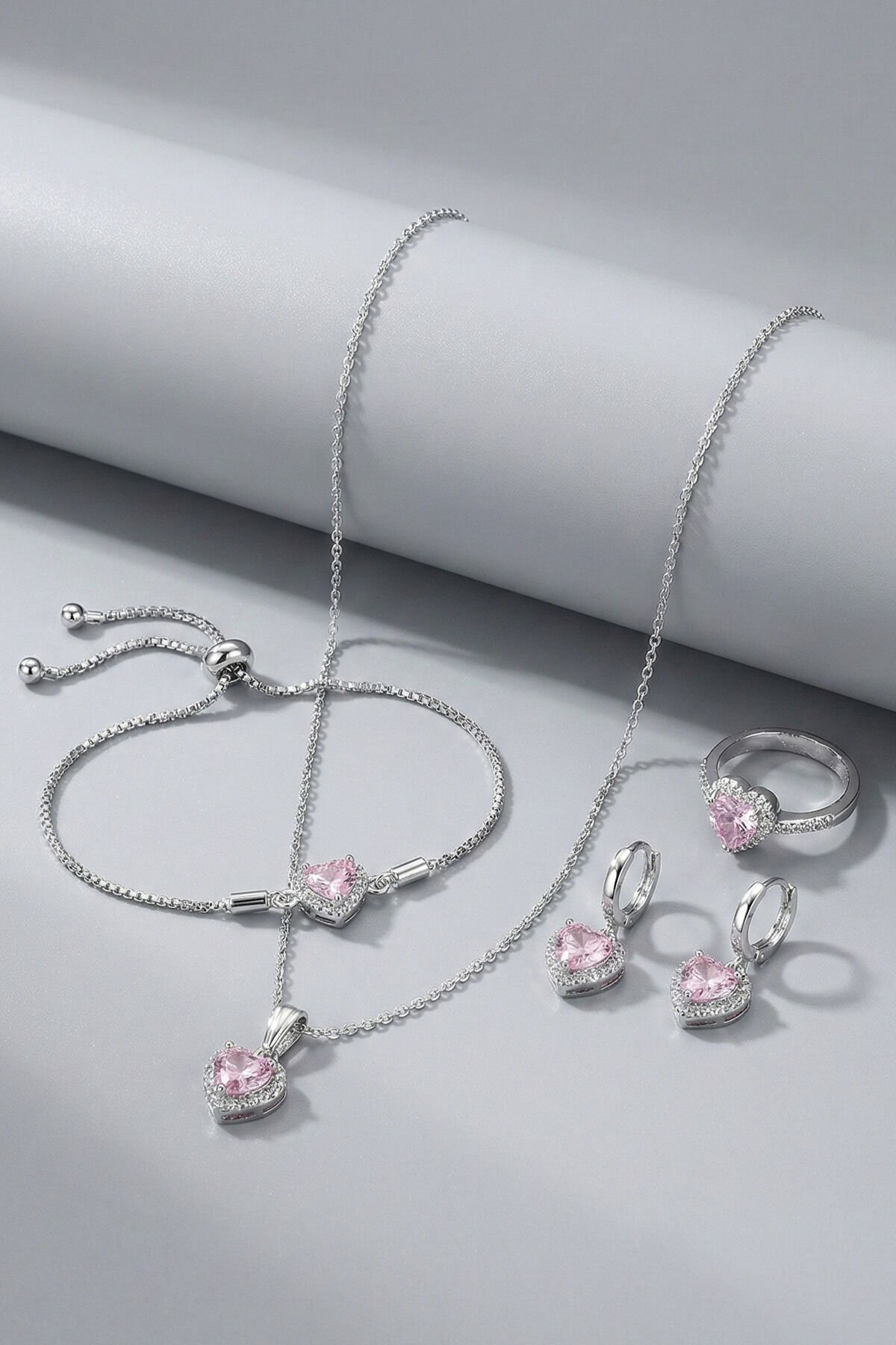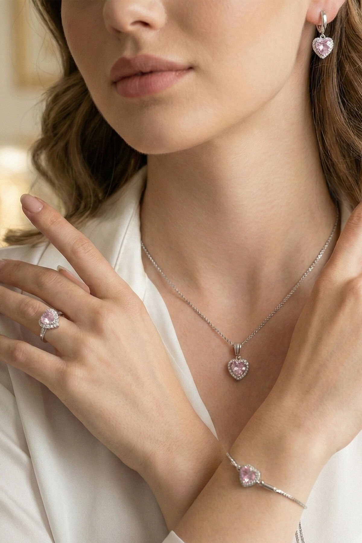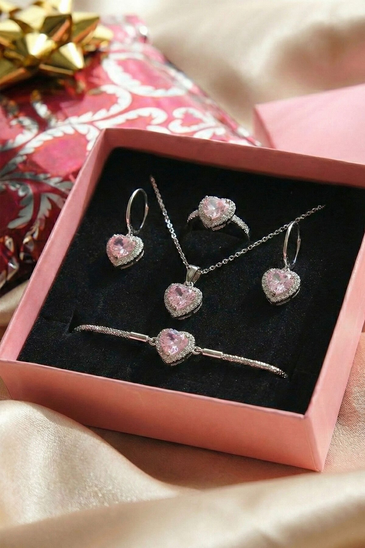 Silver Pembe Zirkon Taşlı Kolye Küpe Bileklik Yüzük Seti Ve Hediye Kutusu Sevgililer Günü