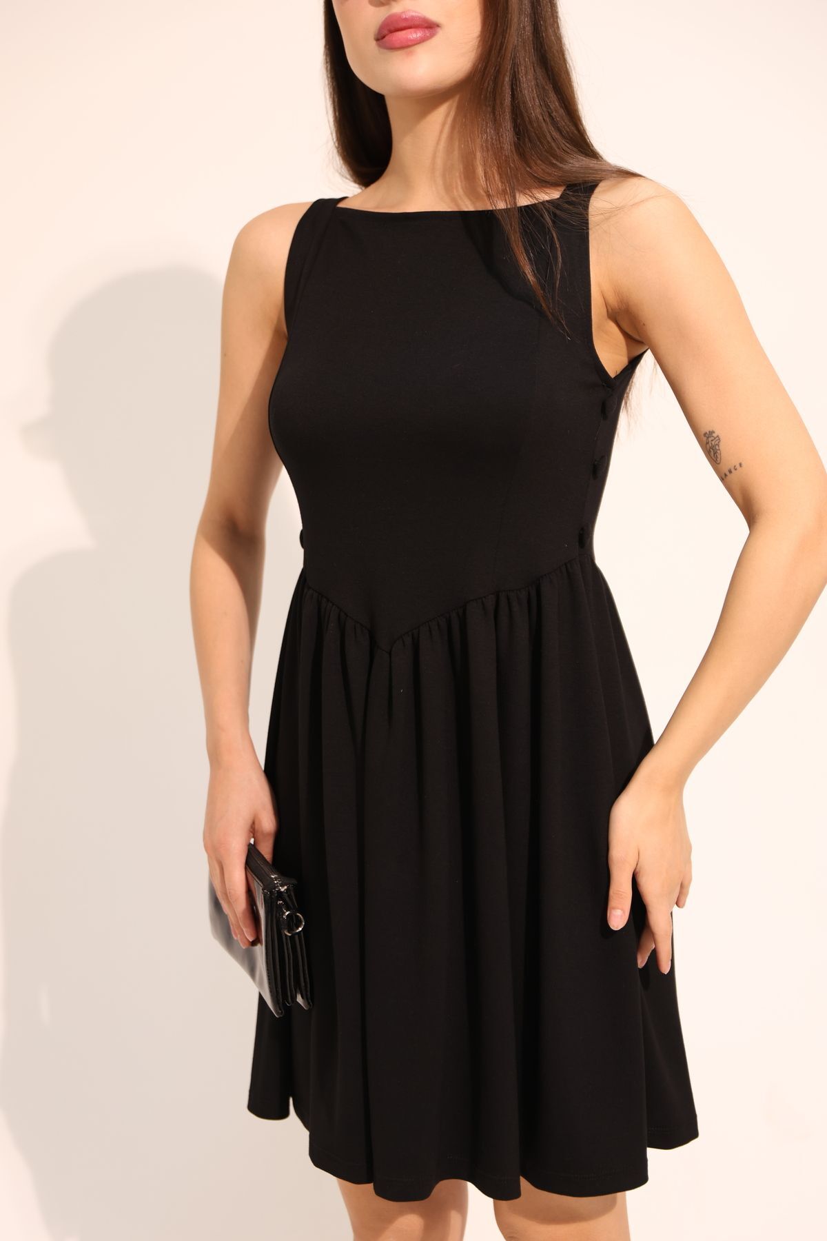 Her kadının gardırobunda olması gereken o "kurtarıcı" parça ile tanışın! Aurrari Siyah Düğme Detaylı Elbise, minimalizmi iddialı detaylarla buluşturuyor. Zarif kare yaka kesimi ve ön paneldeki karakteristik düğme detaylarıyla hem feminen bir duruş sergiliyor hem de viskon örme kumaşının verdiği esneklikle hareket özgürlüğünüzü kısıtlamıyor. İster bir akşam partisinde, ister şık bir öğle yemeğinde; bu elbise size çabasız bir asalet vaat ediyor.